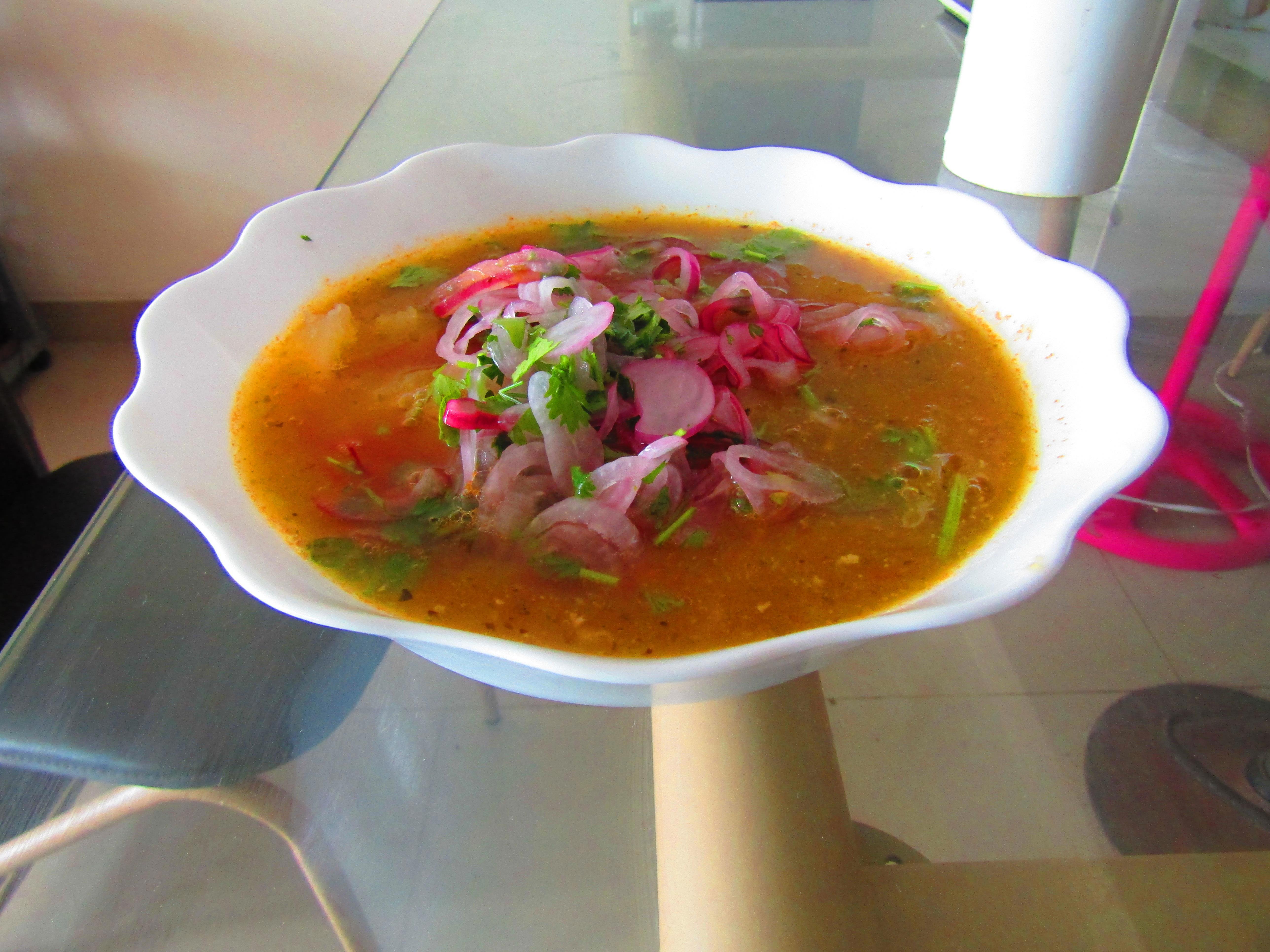 А теперь самое интересное. Вот за что люблю эквадорскую кухню - никаких заморочек. Сначала в отдельной миске маринуем лук, для него оставим немного зелени. Оставшееся, никак не нарезая (!), сваливаем в кастрюлю и варим до готовности юки (15 минут, тунцу дольше не надо). После вылавливаем рыбу и юку (картошку). Первую сразу отправляем в тарелки. Половину юки (картошки) режем кубиком и отправляем туда же, а вот вторую - в блендер. Туда же сваливаем остальные овощи с половиной бульона (вторая - на плите) и перемалываем в пюре. Соединяем пюре с бульоном, доводим до кипения, разливаем по тарелкам. Сверху добавляется маринованный лук с зеленью.