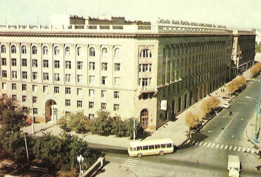 Что между этими двумя зданиями? Улица Пушкина (бывшая Пушкинская). Немного позже, в шестидесятых, она будет перекрыта дополнительным корпусом Мединститута с аркой, которые хорошо видны на фото уже семидесятых: