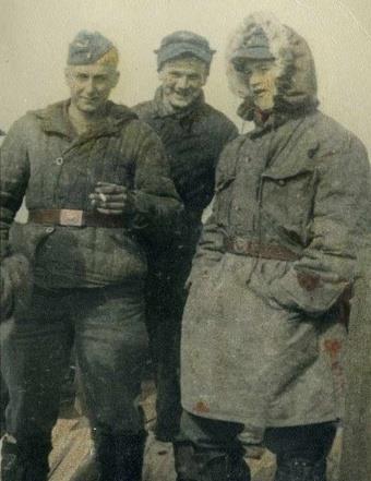 На фото ариец греется сразу двумя способами. Ушанка, к слову - гражданская. То есть отняли у местных.