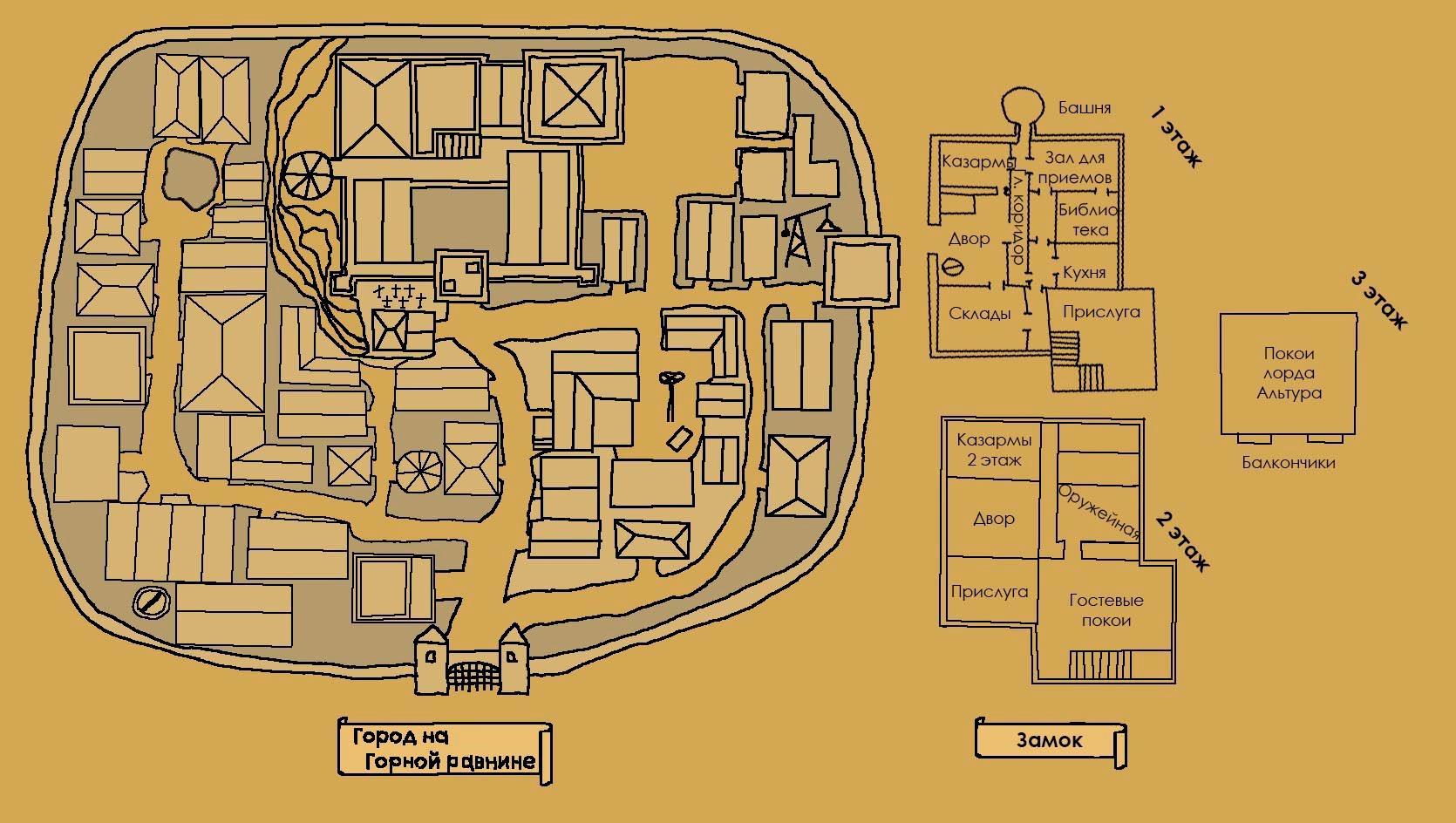 Карта Города на Горной Равнине и план замка лорда Альтура.