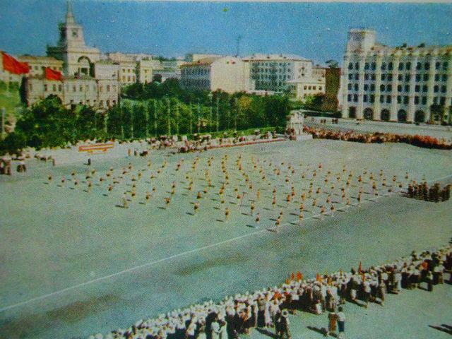 Итак, построено великолепное здание Дома Связи (по проекту уже не раз упоминавшегося Ефима Левитана, кстати), сохранены два старинных здания на улице Гоголя: бывший Дом Репниковой и бывший гвоздильный завод Серебряковых (о них рассказывалось в "Неразлучной парочке"), а между ним и новым зданием такой вот не слишком приглядный вид на торец - другие здания на Гоголя после Сталинградской Битвы не восстанавливались: