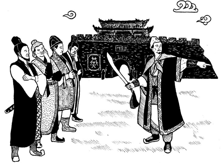 Вместо него будет эпизод из начала главы, когда помощник губернатора Доу Ифу устраивает смотр делегации и требует сменить оружие с парадного на боевое: