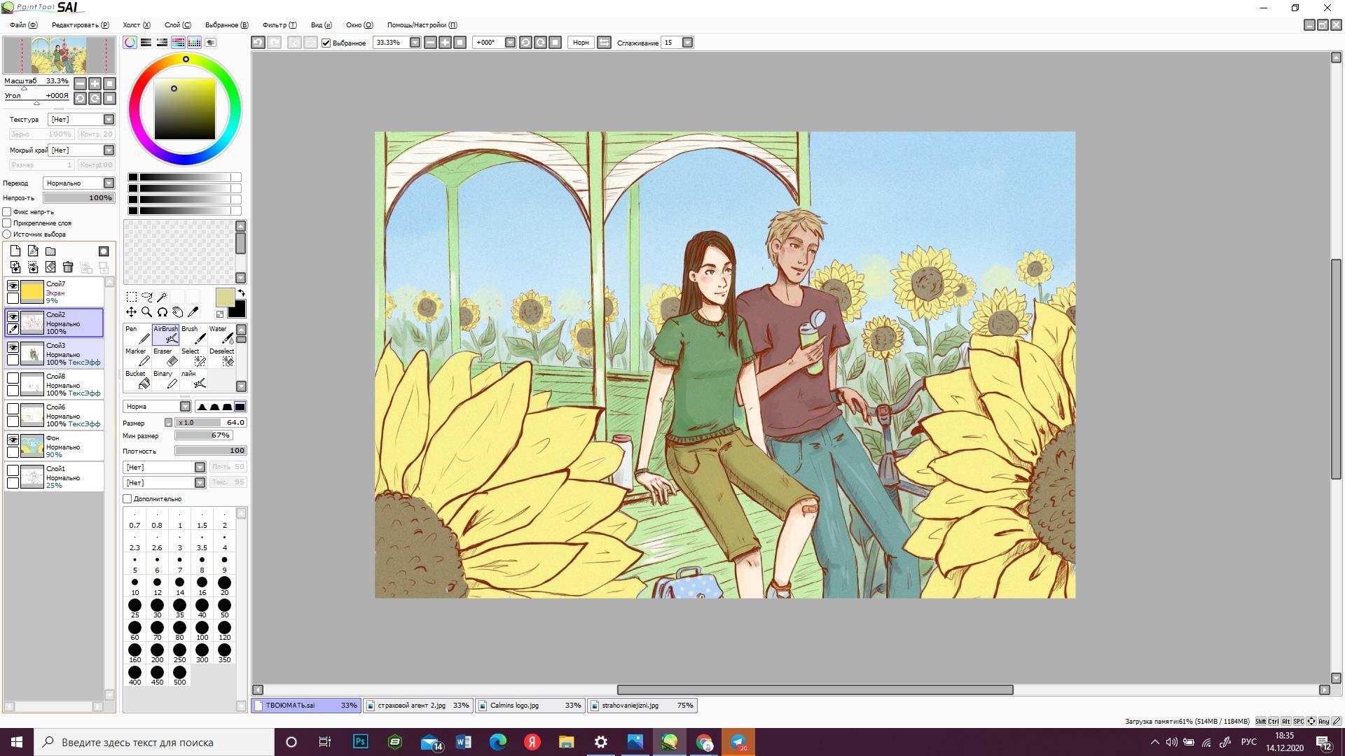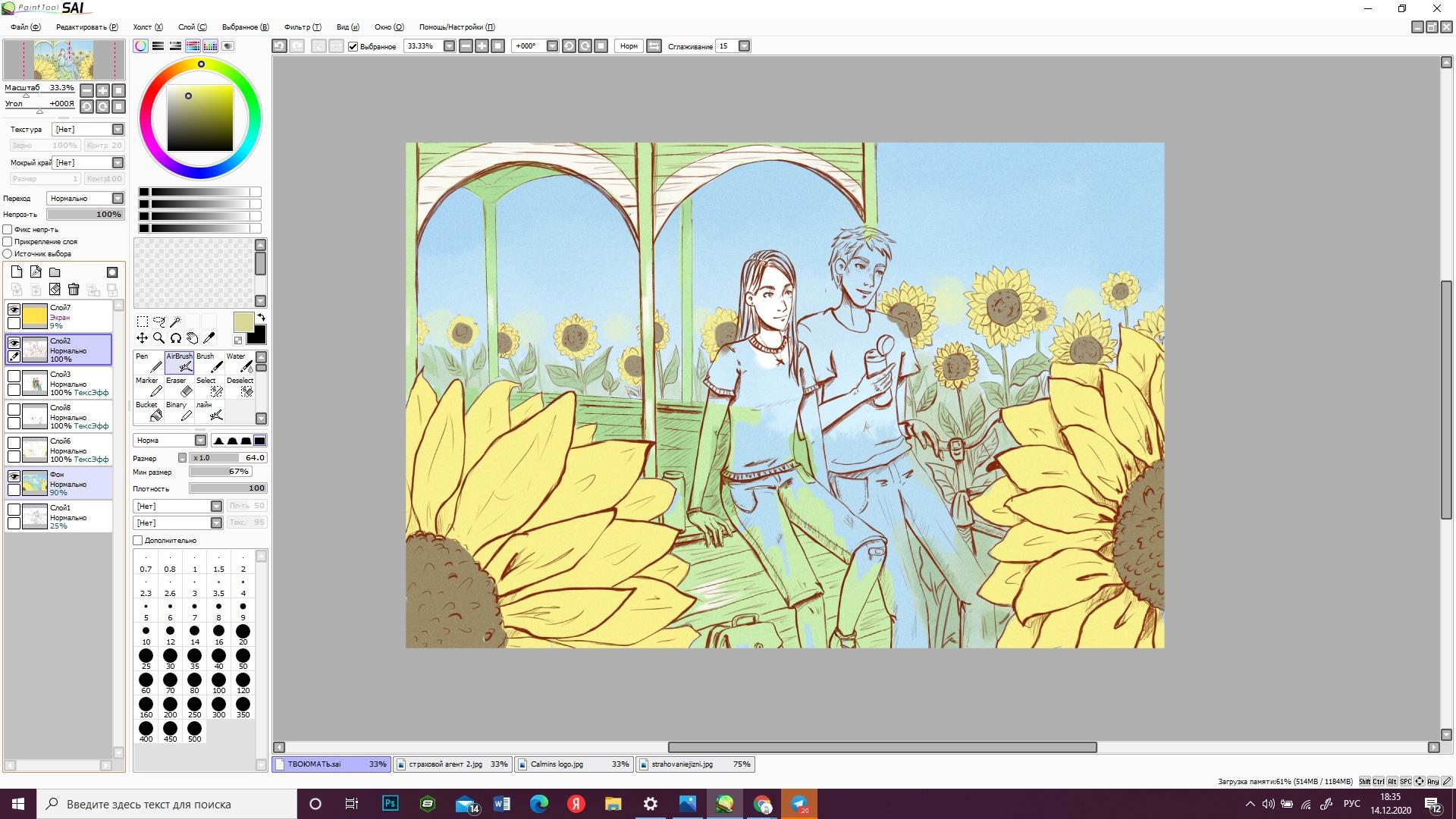 всё, супер, я довольна. очень много штрихов - я график, так что на живопись не претендую и работаю в основном маркером, который у меня мимикрирует под акварель. но сначала я делаю основные цвета фона: в сюжете тут лето, да и подсолнухов куча, так что с цветами гадать не приходится.