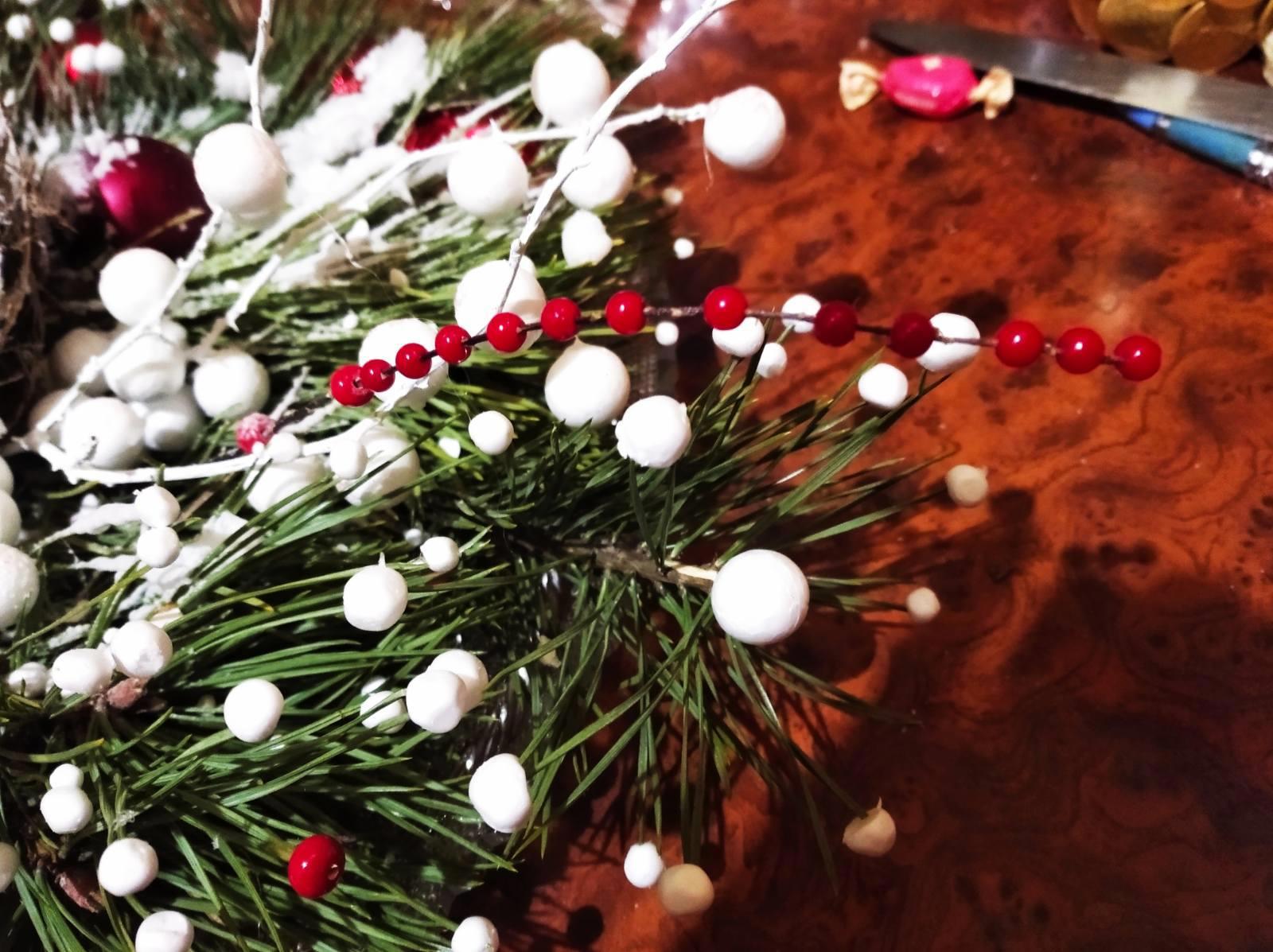 Жидким снегом покрывать лучше в финале сборки. Мой снег маде зи дойч, у меня там подружка замужем, так привозит всякую поебень, будто у меня своей мало. Но этот немецкий снег, девчонки, в сто раз лучше чем наш. Выглядит естественнее и держится хорошо. Можно добавить ещё немного красного, к примеру, утыкать тонкий прутик красными бусами и собрать из бусинок тычинки. Верхнюю я посадила на клей для декупажа, но можно и на горячий клей.