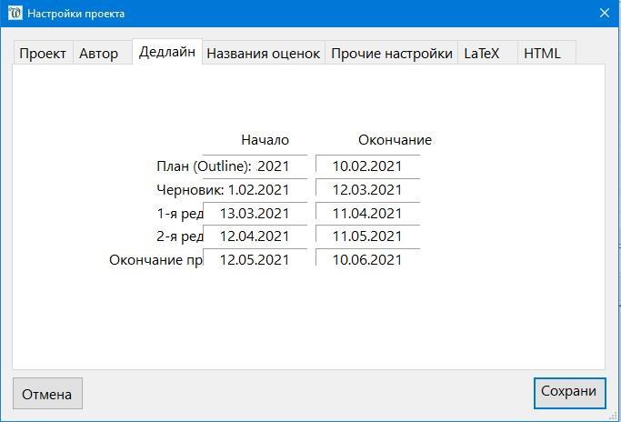 3. Проект / Настройки проекта – например, можно задать дедлайны для каждого этапа работы с текстом.