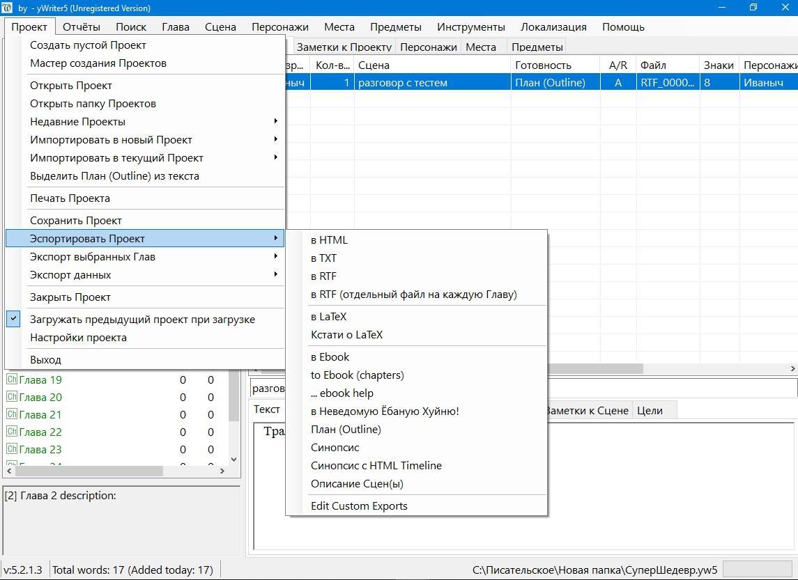 6. Когда всё написали, скомпоновали порядок сцен/глав как хочется, выгружаем (весь или выборочно) текст в любой формат - Проект / Экспортировать проект / в rtf или во что угодно. (не смотрите на забавные подписи в меню, это было в 5й версии