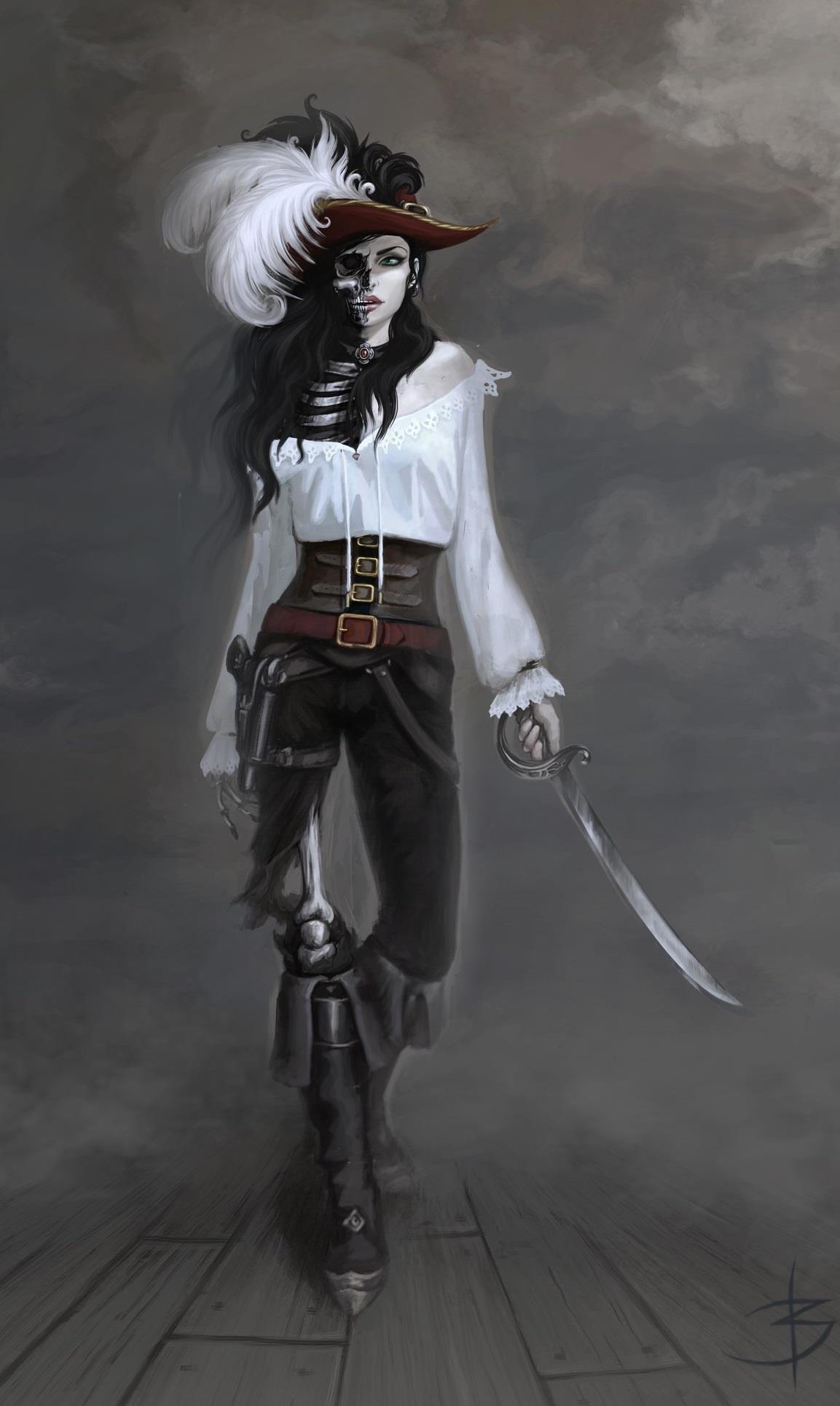 «Из вновь сгустившейся тьмы выступила красивая, черноволосая женщина, облаченная в расшитый золотом черный жюстокор, белую, с глубоким вырезом и множеством кружев рубашку, обтягивающие бриджи, опоясанные несколькими перевязями с пистолетами и парой сабель, закатанные ботфорты из черной, усеянной металлическими клепками кожи. А также изящную широкополую шляпу с богатым плюмажем. За спиной у красотки стоял мертвец с факелом, освещавшим лишь левую половину ее лица. Вперед выступил еще один мертвец в матросской форме, с ламой.