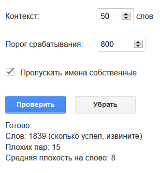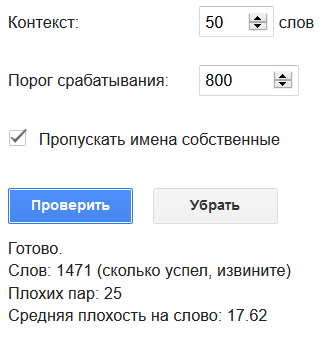 На скрине выше так же виден результат проверки. На полторы тысячи слов он нашёл 25 “плохих” пар. Средняя плохость, это что-то вроде рейтинга, по которому можно сравнивать разные куски текста. Чем значение ниже, тем фрагмент “чище”.