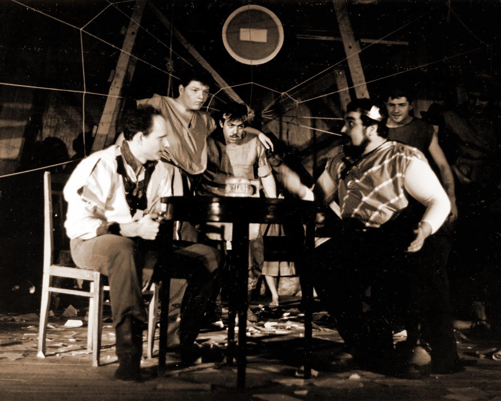 Автор: Генри Лайон ОлдиБыл 1989-й год, мы ставили спектакль «Трудно быть богом» в театре-студии «Пеликан». Начало спектакля я представлял себе отчетливо. Открывается занавес, темная сцена затянута паутиной из натянутых веревок — в паутине будут путаться, не находя выхода, персонажи. У задника возвышается огромный строительный козел, похожий на башню — на постройку настоящей башне у бедного театра средств не хватало. По центру «башни» висит дорожный знак «кирпич». В сумраке бродят тени. Звучат два голоса: женский и детский. Мать учит с ребенком местное святое писание. Когда голоса смолкают, начинается величественная Месса си-минор И. С. Баха.
