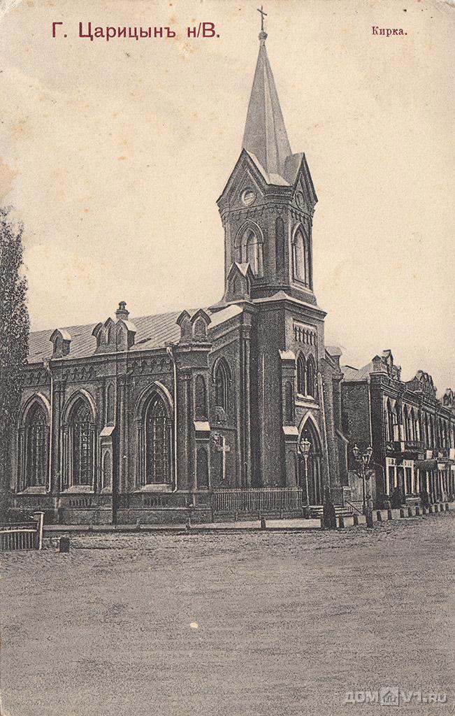 Возвращаемся в конец девятнадцатого века, когда оно было построено. Город во все времена был многонациональным и многоконфессиональным, поэтому на рубеже позапрошлого и прошлого веков в нём были разные храмы: православные, армяно-григорианские, католические, мечети, синагоги... Была в нём и лютеранская кирха, построенная в 1893 году и славившаяся своим органом так, что многие горожане и гости Города, даже исповедавшие другие религии, приходили в кирху послушать его. Из-за своего непривычного для Царицына "готического" вида кирха достаточно быстро стала одной из "визитных карточек" Города и попала на многие фотографии и открытки: