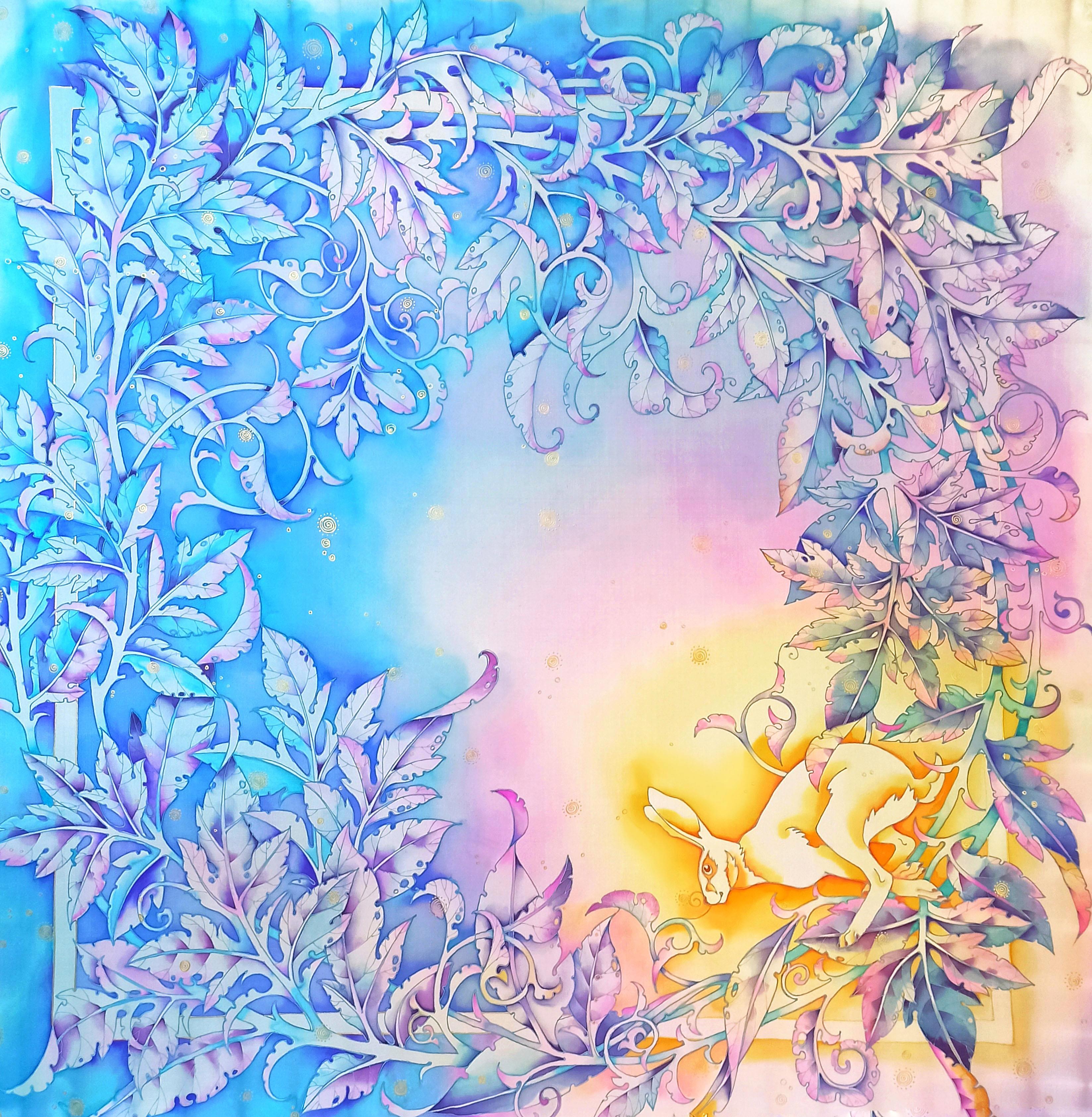 Это золотой солнечный зайчик скачет по морозным веткам и листьям, кружится посолонь, разгоняя колесо года, приближая весну:)) Большой шёлковый платок, 114х114, холодный батик, парозакрепляемые краски:))