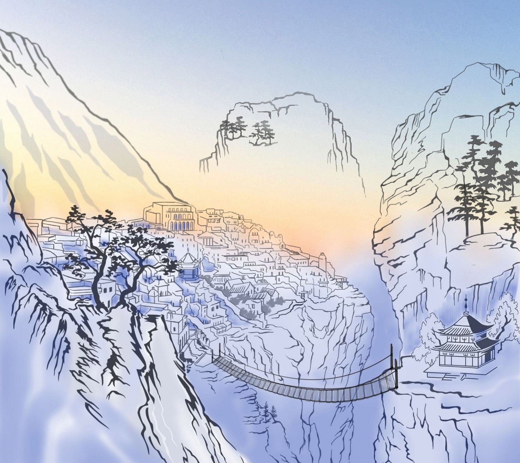 Лапидарность соседствует с прихотливостью линий, детальность прорисовки - с обобщениями, контурность - с полутонами, а монохром - с удивительным воздушным градиентом. Это первые главы. Не какой-то конкретный момент, но именно впечатление от мира горной страны.