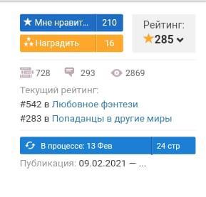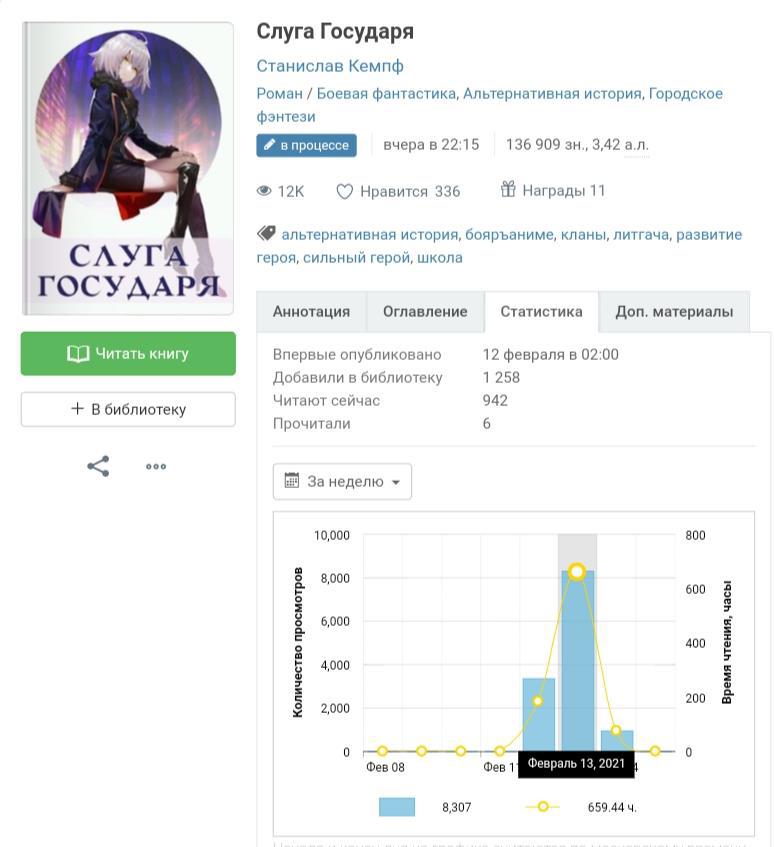 Краткая информация. Публикуется на АТ с октября 2018 года. С того момента на его бесплатной первой книге набралось чуть больше 1700 библиотек. На второй, платной, начатой в феврале 2019 года и законченной в октябре 2020 года - набралось 890 библиотек.