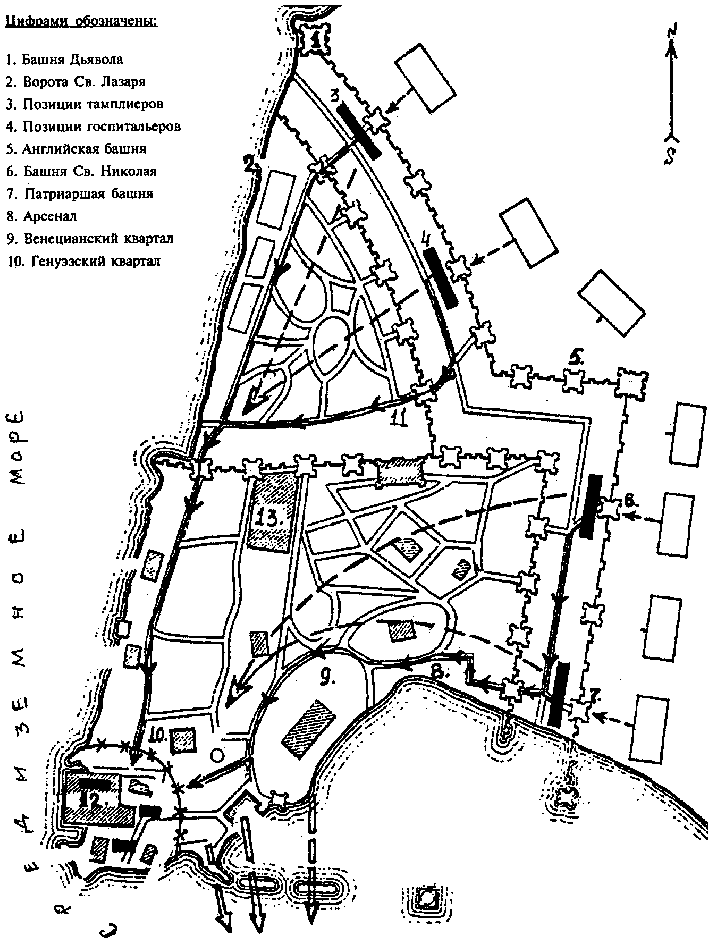 «Одна из машин, которую называли Хавебен [габ-дан — яростная], иначе сказать — Гневная, находилась перед постом тамплиеров; а другая машина, метавшая на пост пизанцев, называлась Мансур, то есть Победоносная; следующая, большая, которую я не знаю, как назвать, метала в пост госпитальеров; и четвертая машина метала в большую башню, называемую Проклятая башня, которая стоит на второй стене и которую защищал королевский отряд. В первую ночь они поставили большие щиты, и щиты, сделанные из прутьев, выстроились перед нашими стенами, и на вторую ночь они приблизились еще, итак приближались, покуда не подошли к водяному рву, и за названными щитами были воины, сошедшие со своих лошадей на землю с луками в руках».