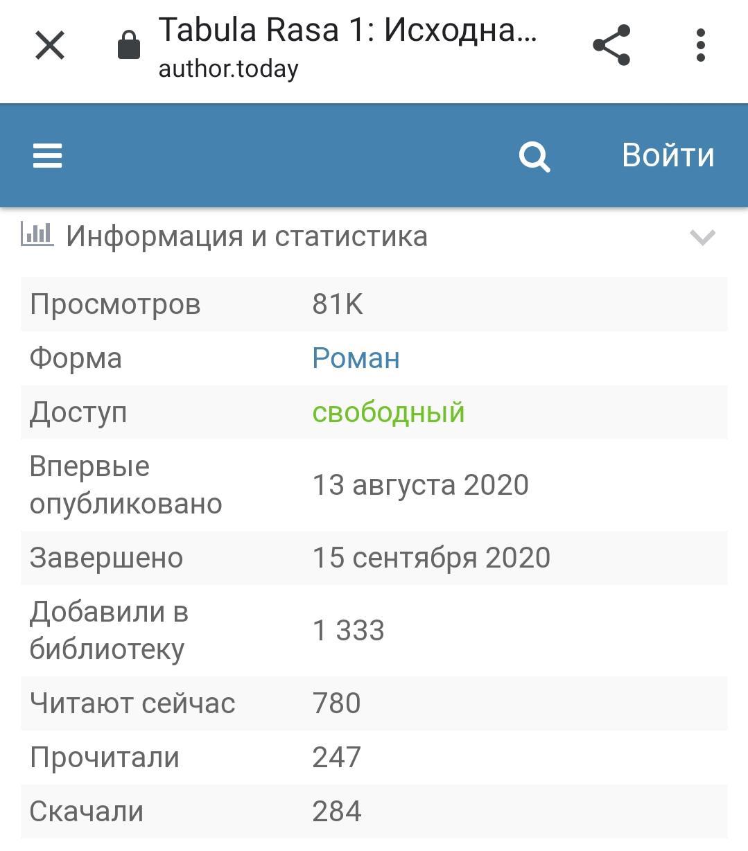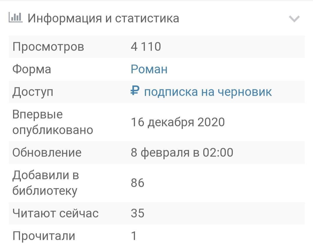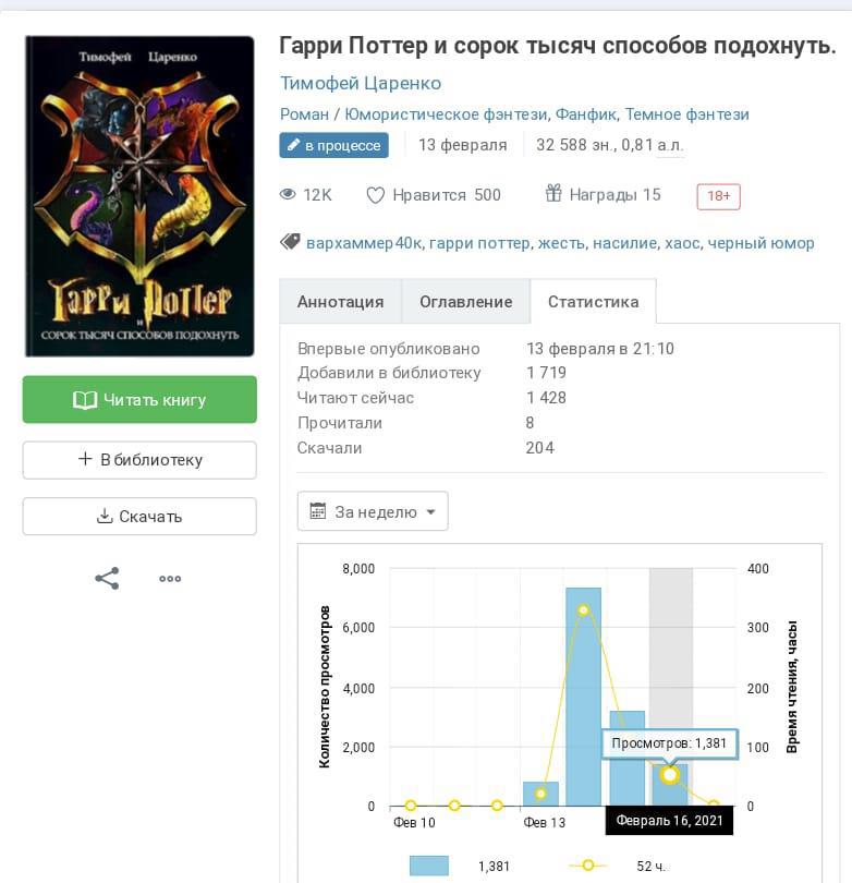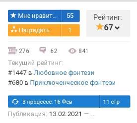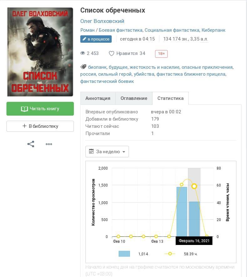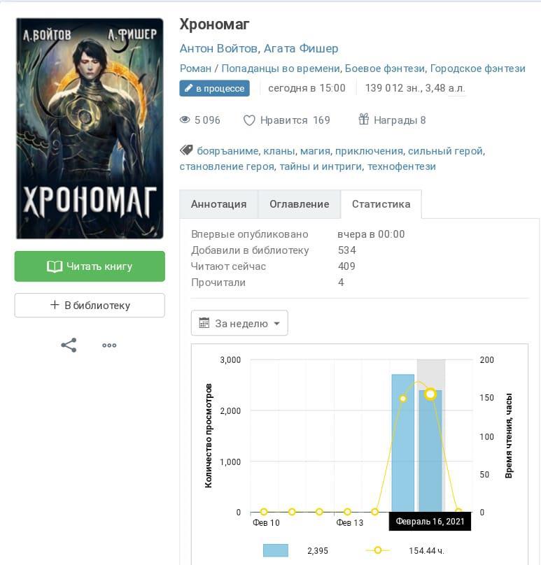 Краткая информация. Публикуется на АТ с октября 2018 года. С того момента на его бесплатной первой книге набралось чуть больше 1700 библиотек. На второй, платной, начатой в феврале 2019 года и законченной в октябре 2020 года - набралось 890 библиотек.
