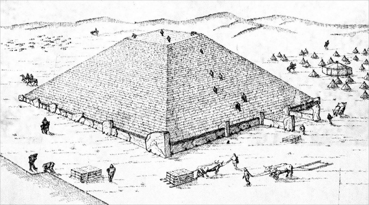 Поверх внутренней пирамиды строители насыпали основной курган. Археологи говорят, что склоны прямоугольной пирамиды в качестве дополнительной защиты были выложены дёрном поверх слоя глины. Именно этот момент строительства изображён на первой картинке-реконструкции. Однако это всего лишь версия, хотя и достаточно логичная.