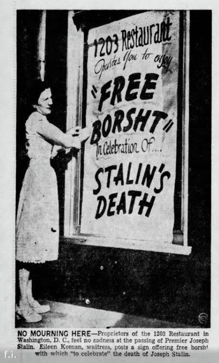 Ресторан "1203" приглашает на бесплатный борщ в честь празднования смерти Сталина, 9 марта 1953 года, Вашингтон