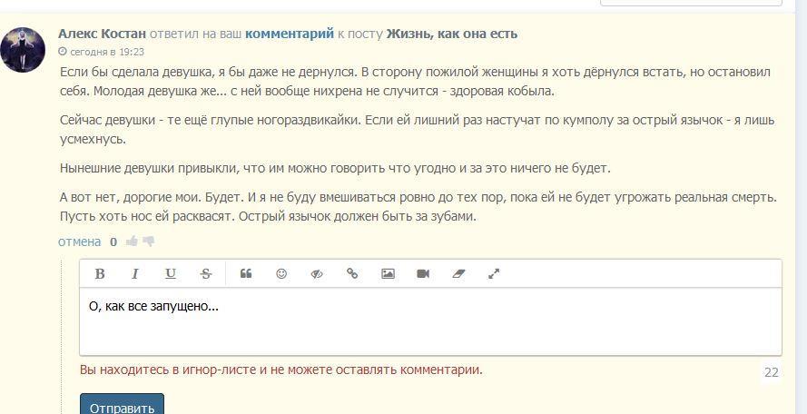 Народ, прочитал я сегодняшний пост неуважаемого ( с этого дня!) мною Алекса Костана - кто хочет, может сам найти, мне его рекламировать как-то в лом... - где автор описал как героически он поступил, не став защищать бабульку в автобусе, сделавшую замечание молодому психу/ отморозку. За что, соответственно, получила от того урода зуботычину. То бишь, он(автор!) вроде как даже привстал... но потом сел, резко поняв что бабулька не права, а прав ОН - автор поста, что остался сидеть на месте. Типа, так ей и надо, грымзе старой - не лезь, куда не просют. Мне бы пройти мимо, но раз автор выложил свой героический поступок на всеобщее обозрение - не удержался. Каюсь. Высказал предположение, что будь бы там не бабулька, а девушка - наш герой поступил бы несколько иначе. Но наш герой оказался тверд и последователен - предполагаемая девушка была послана оценена еще хуже(смотреть ниже!), а я - в игнор, або не смел более перечить(?) или сумлеваться в  моральных поступках автора поста. Собс/но, и хрен бы с ним... но заело любопытство: народ, а в особенности - девушки, ваше мнение и реакция на сего человека? С учетом того, что я заскринил в ответ на мой невинный вопрос...