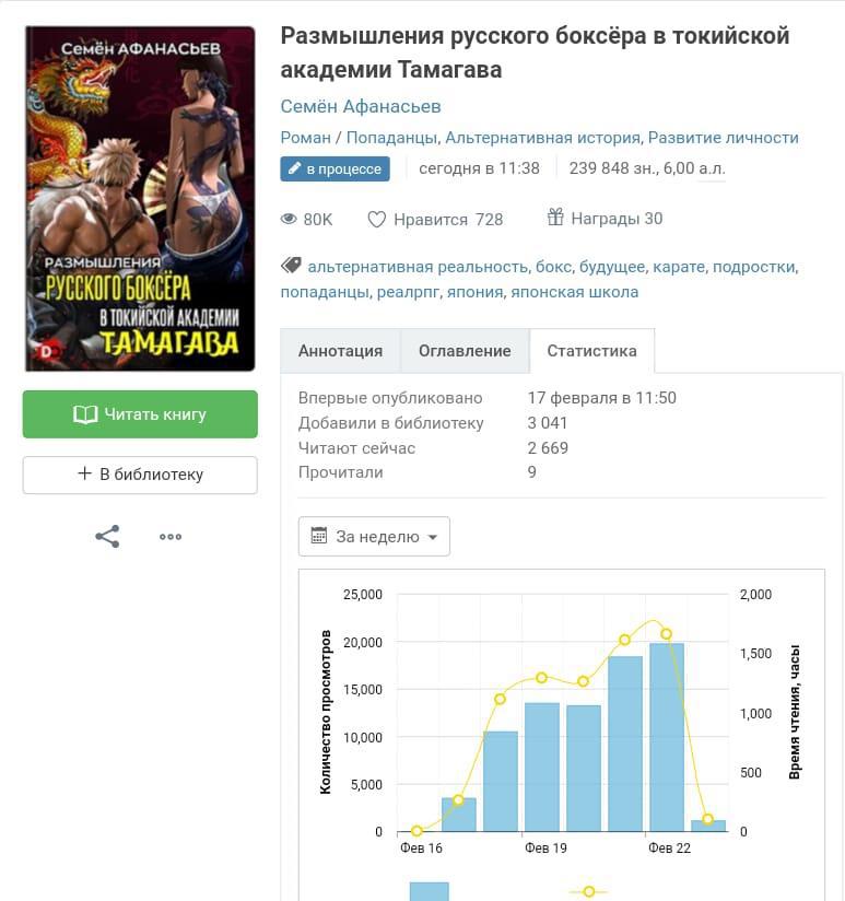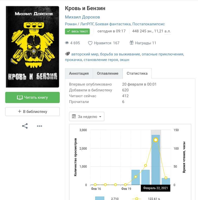 9. Михаил Дорохов. Публикуется на АТ с января 2018 года. На момент старта имел чуть больше 400 подписчиков, из которых более 300 были неактивны из-за двух крупных перерывов между выкладками книг. Встал с новой книгой в ГН на третьи сутки после её старта.