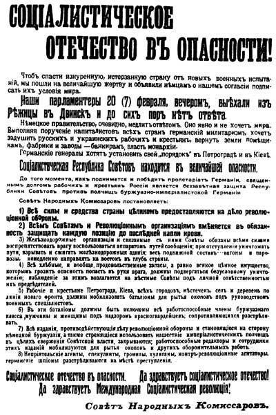У Ленина начинается истерика. 21 февраля Совнарком принял (и на следующий день опубликовал) ленинский декрет «Социалистическое Отечество в опасности!», обязывавший советские организации «защищать каждую позицию до последней капли крови». (Ишь ты, даже слово "Отечество" вспомнил, болезный, как припекло!)