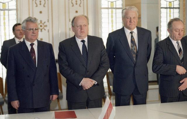 Президент Украины Леонид Кравчук (слева), Председатель Верховного Совета Белоруссии Станислав Шушкевич (в центре) и Президент России Борис Ельцин (2 справа) после подписания Соглашения о создании Содружества Независимых Государств в Беловежской пуще: