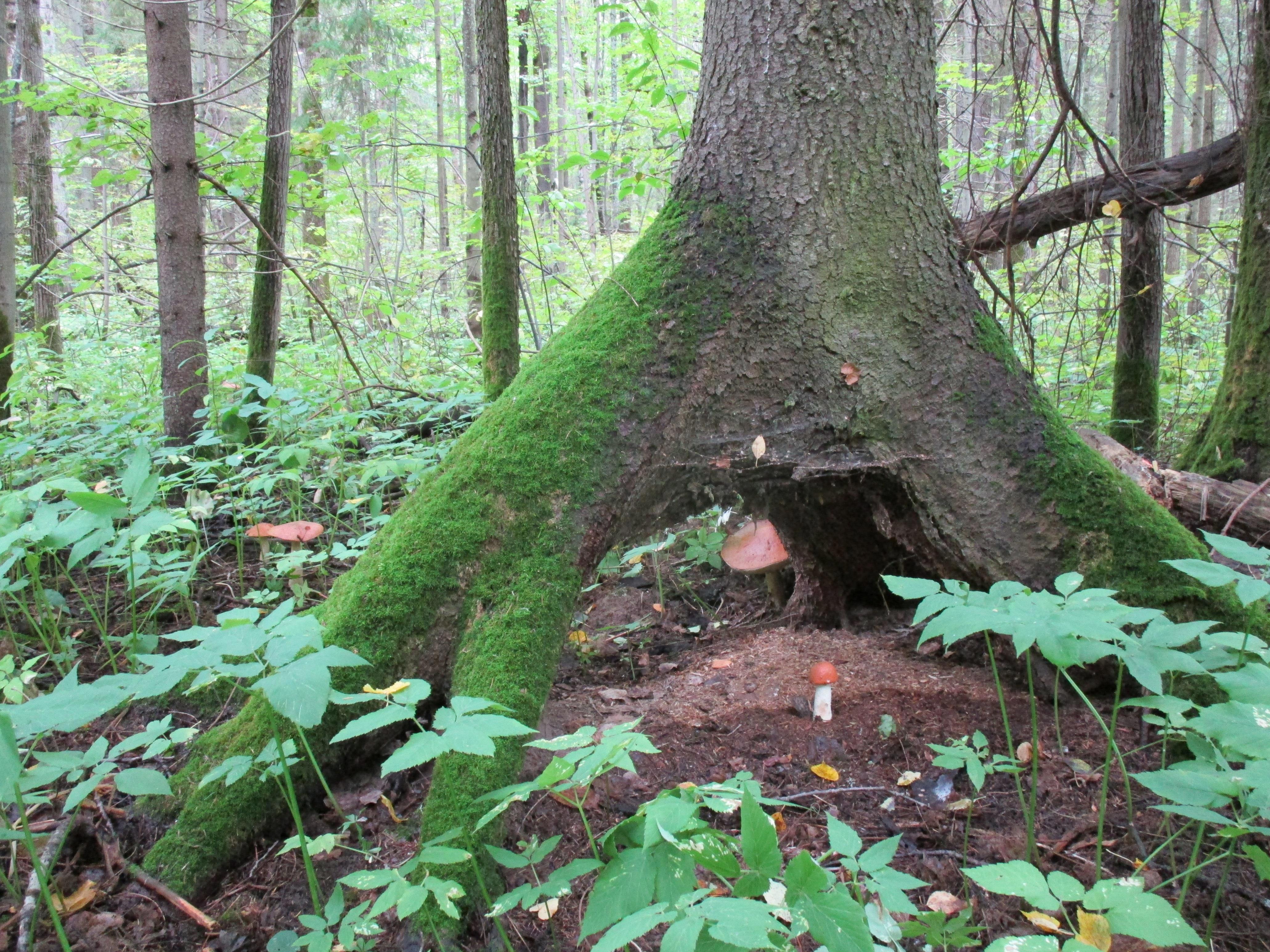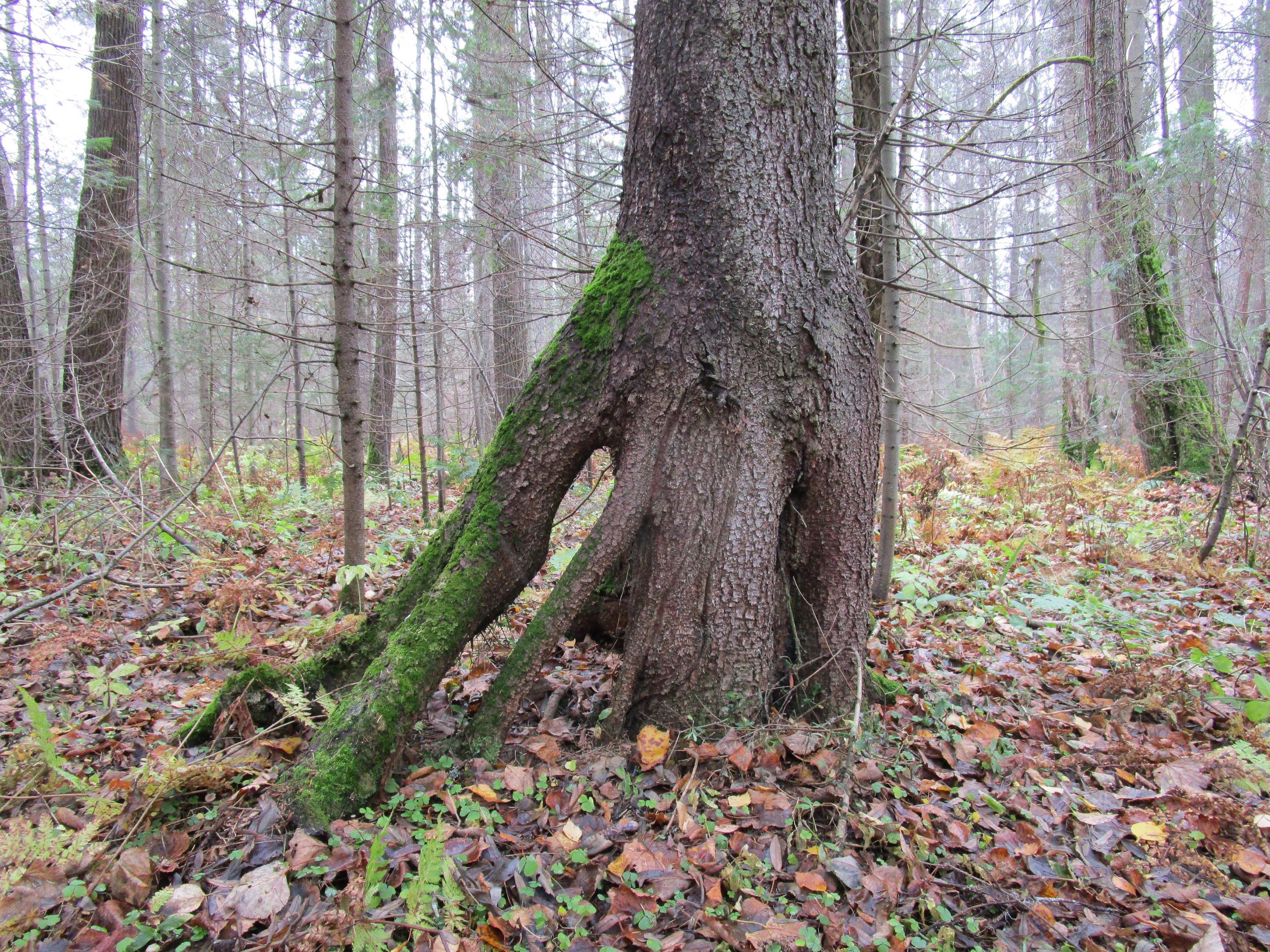 Разгадка же этого феномена проста. Когда-то семена деревьев, попав в щели трухлявых пней, особенно на старых вырубках, прорастают и легко пронизывают своими корнями разлагающуюся рыхлую древесину. Корневая система молодого дерева формируется не в грунте, а в пне - над уровнем почвенного покрова. После полного разложения и разрушения пня корни молодых деревьев оказываются обнажены. Именно так рождаются "шагающие деревья".