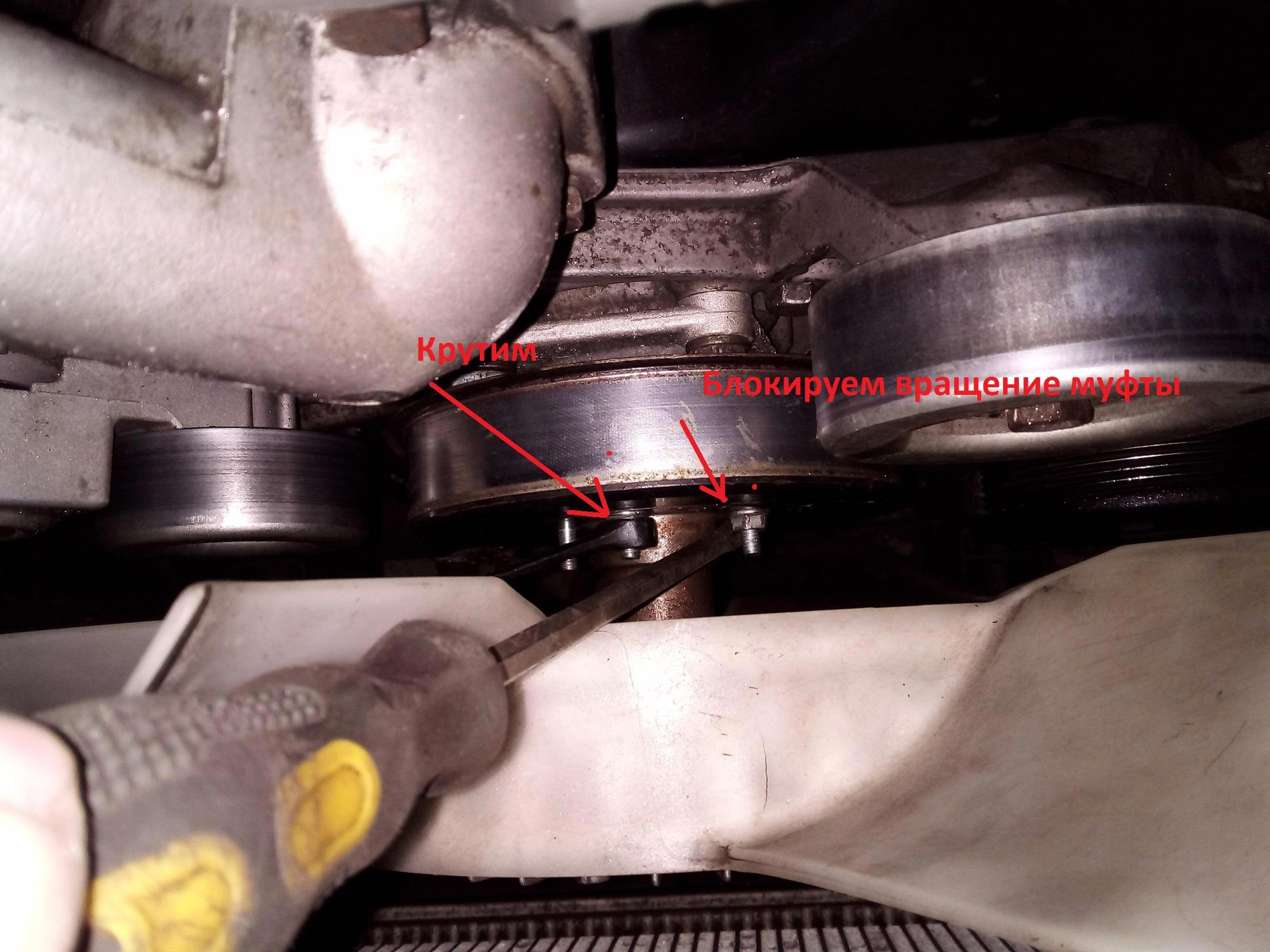 Но можно было сначала открутить муфту вентилятора, пока её держит ремень. Но это не наш метод! Берем отвертку, вставляем её между валом и шпилькой, и держа отвёртку крутим гайку. Потом поворачиваем шкив, и крутим следующую.