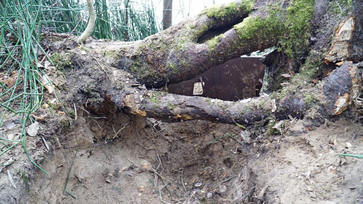 Начали добычу. Вспомогательными задачами было не убиться самим и не сломать берёзу. Сложность была в том, что дерево одним из толстенных боковых корней опиралось на третью грань щита, а его мелкий корень (в четыре пальца толщиной) насквозь пророс сквозь одну из пробоин.