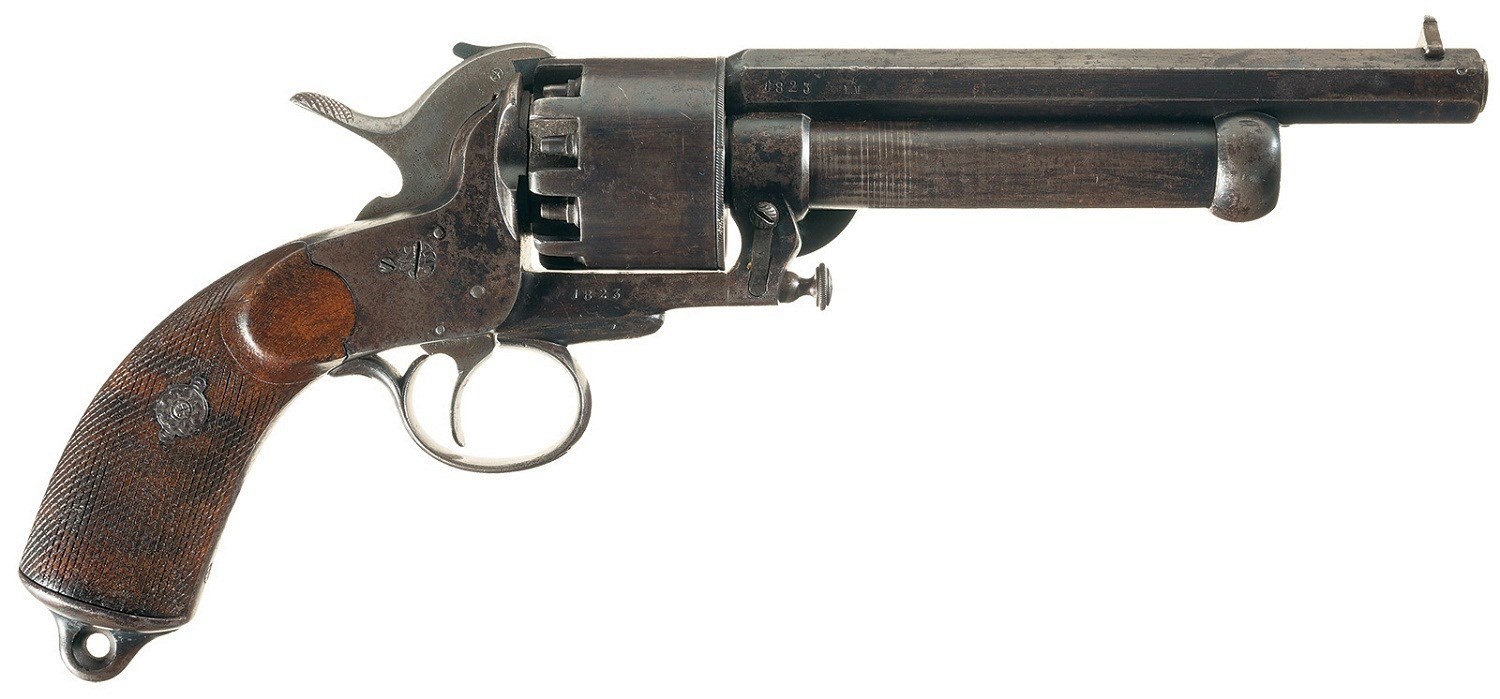 Были и «правильные» револьверы до Кольта. Были и во время Кольта. Вот такой например чудо револьвер «Ле Ма» от 1859 года. Не слышали? А он, между прочим, тоже был весьма популярен. И конструкция у него была оригинальная и по тем временам вполне «продвинутая». Да и вообще... У него, между прочим, в барабане целых 9 патронов было вместо 5-ти или 6-ти у Кольта, хоть калибром немного и поменьше. Мало? А второй ствол с зарядом картечи по центру барабана Вас удовлетворит? Это уже почти подствольный гранатомёт. Вот так вот — грозная штука, однако: