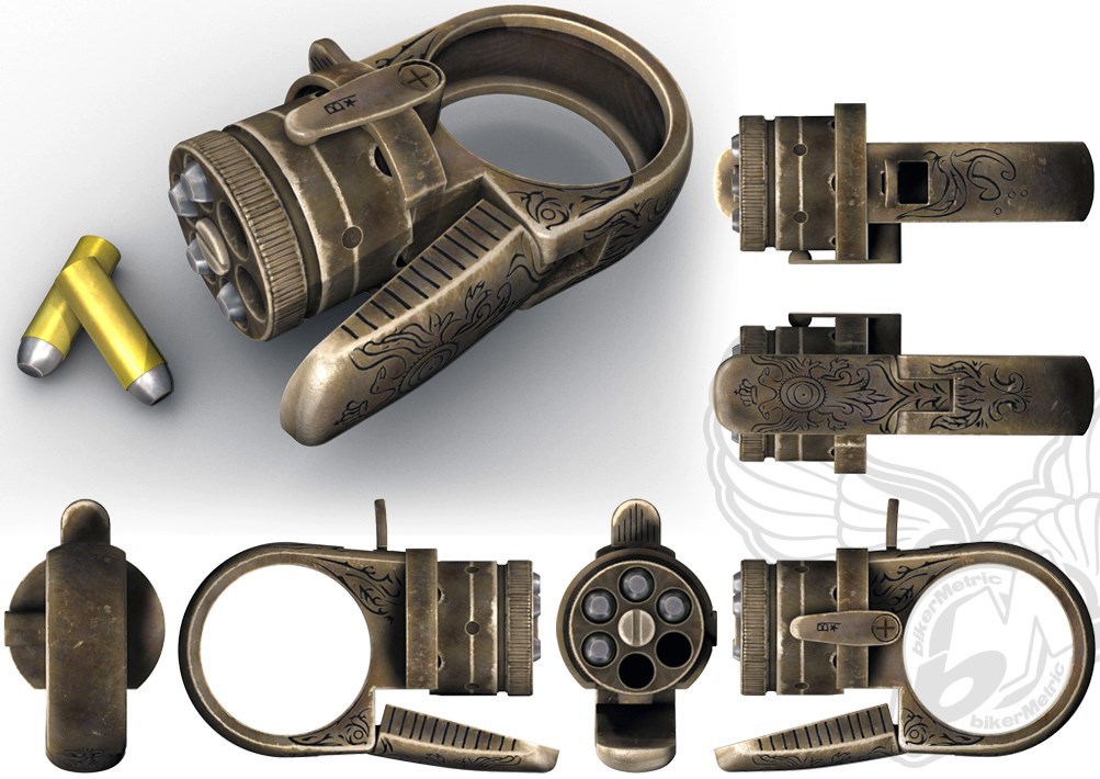 Чтобы не создавалось впечатления, что все первые револьверы были большими и массивными, придётся вспомнить об ещё одной "скорострелке", использующей револьверный принцип. Но на этот раз это оружие удивляет как раз своими миниатюрными размерами. Револьверы подобной конструкции выпускались разными мастерскими и носили разные названия типа "Маленький защитник", но сейчас они всё же больше известны под названием "Femme Fatale", то есть - "Роковая женщина". Действительно - чаще их владельцами были именно женщины. Ведь для мужчин выпускали пистолеты-трости, ...-часы, ...-ключи, ...-портсигары, ...-зажигалки, ...ручки и прочее. Японцы даже пистолет-чернильницу сделали когда-то. Я вспомнил именно про перстень только потому, что он был револьвером всё же. Вот эта "бесстволка" изготовленная в 1870 году:
