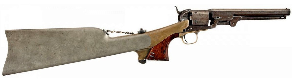 Нельзя не отметить, что первые револьверы (да и последующие, если быть честными до конца) были часто достаточно массивными и сделать точный выстрел из такой штуковины достаточно сложно. Поэтому часто револьверы дополнялись специальными "удобствами". Одним из самых распространённых "удобств" был съёмный приклад, который превращал револьвер в лёгкий карабин. Вот такой комплект Кольта Драгун: