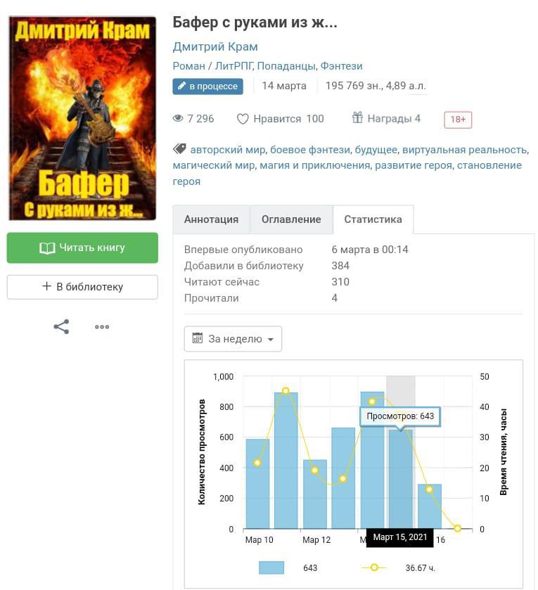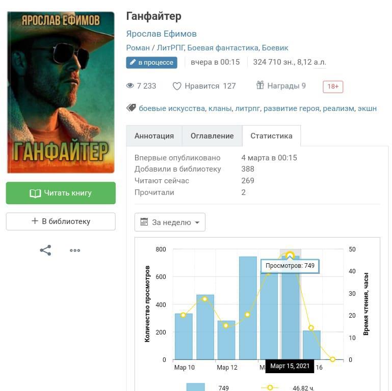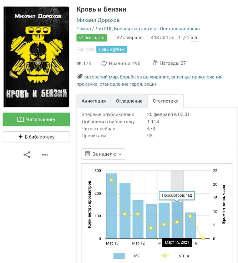 9. Михаил Дорохов. Публикуется на АТ с января 2018 года. На момент старта имел чуть больше 400 подписчиков, из которых более 300 были неактивны из-за двух крупных перерывов между выкладками книг. Встал с новой книгой в ГН на третьи сутки после её старта.
