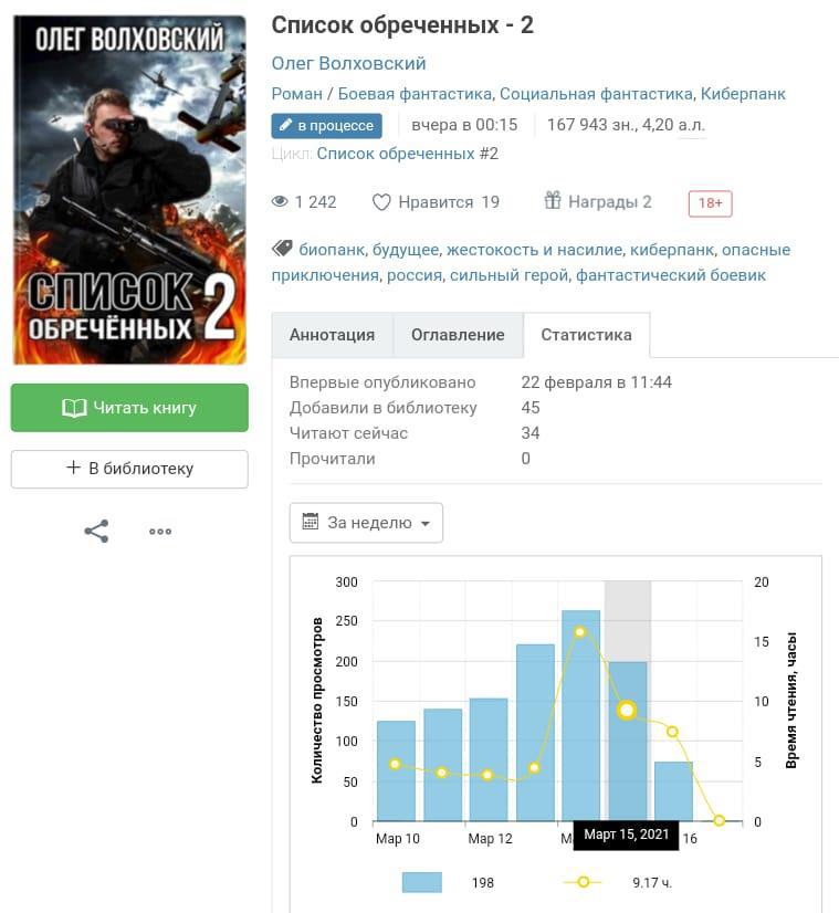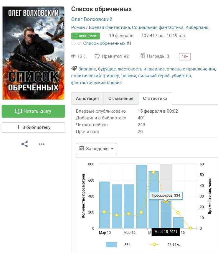5. Олег Волховский (Наталья Точильникова). Получила КС на базе того, что она публикующийся на бумаге автор. Решила начать заново, на новом аккаунте под привычным уже по бумажным изданиям псевдонимом Олег Волховский. Несмотря на то, что Наталья пишет неформат (жанр книги по сути - политический триллер с элементами остросюжетного фантастического боевика), результатами она осталась довольна и решила продолжить серию.