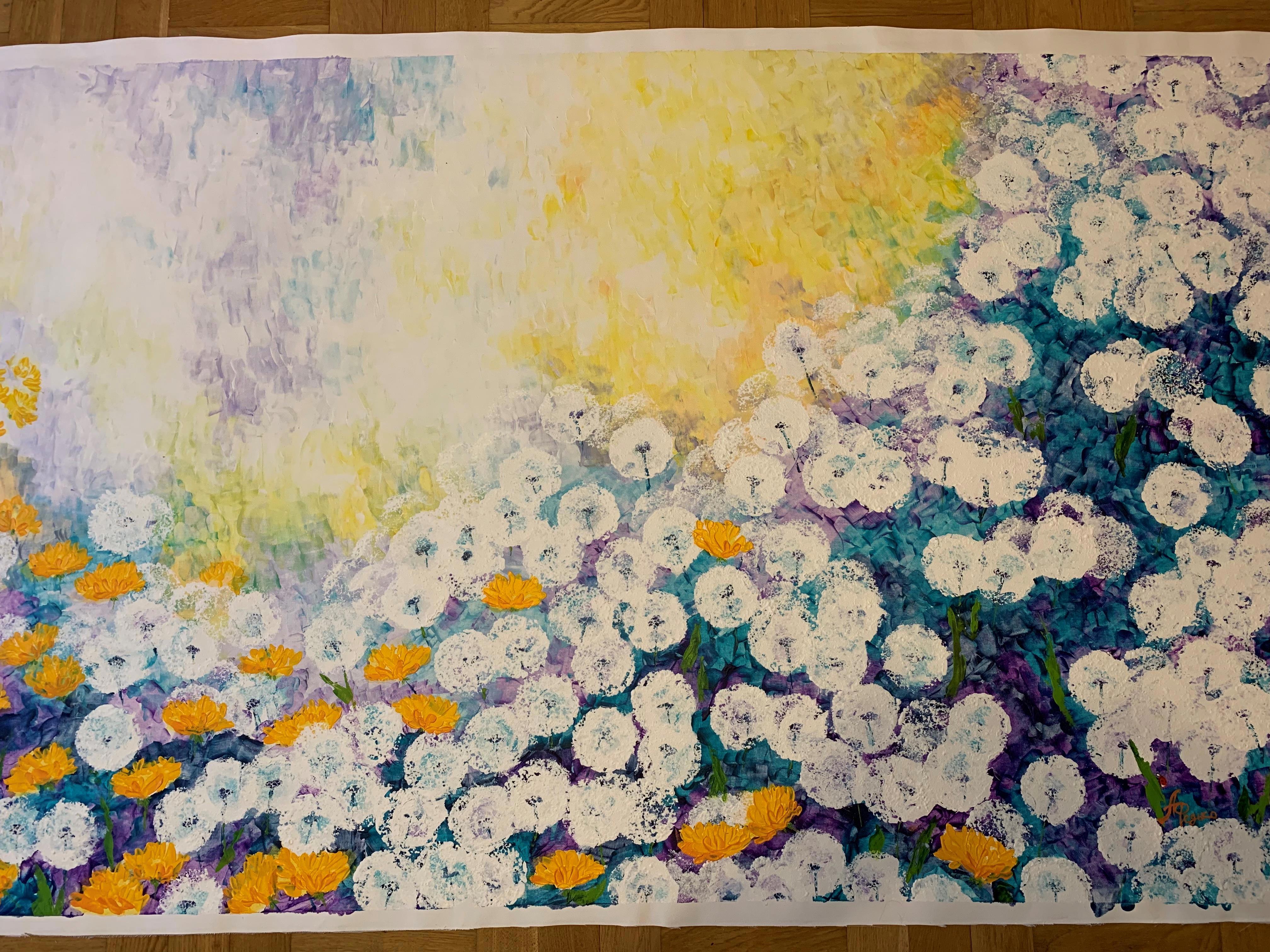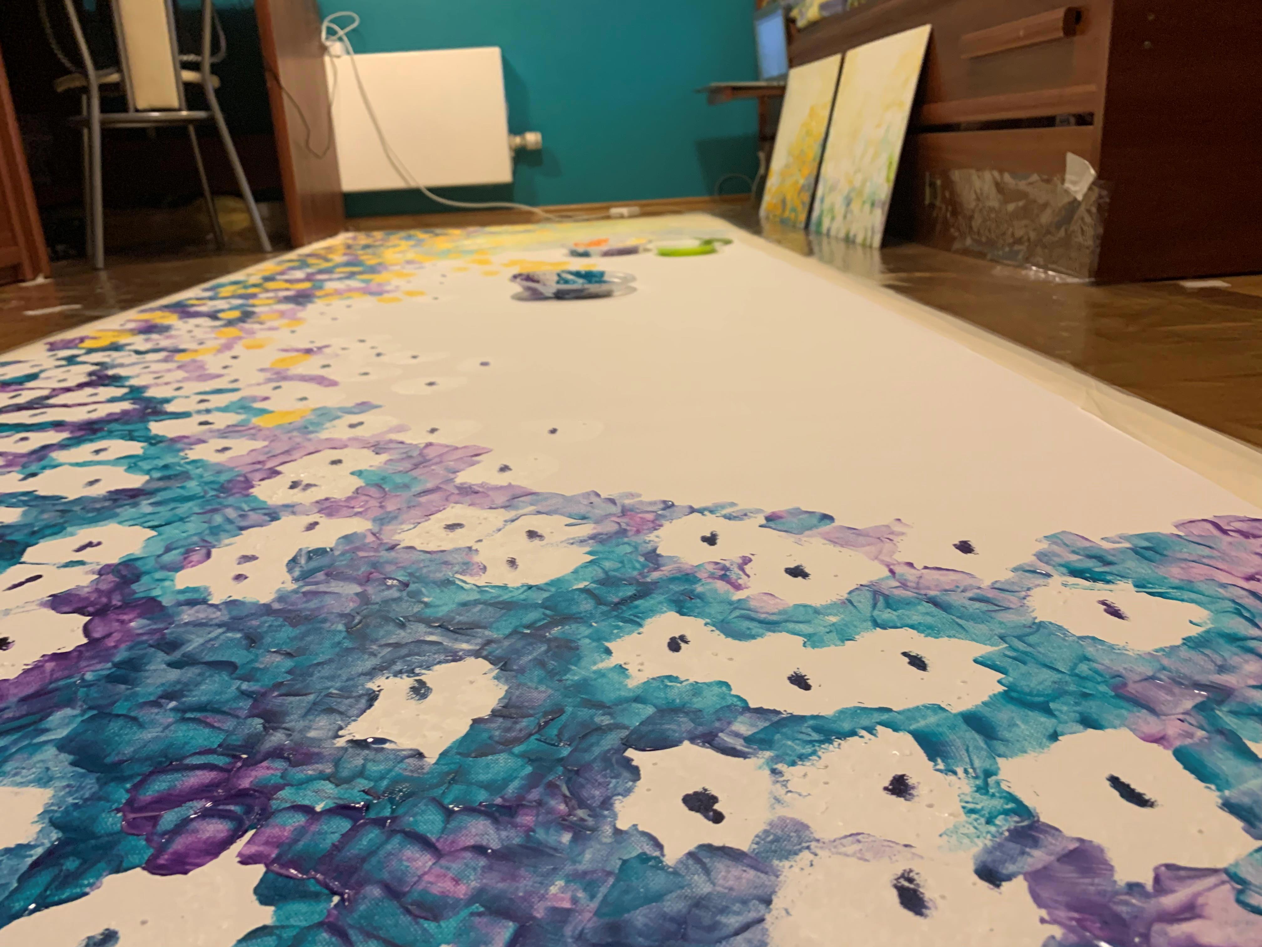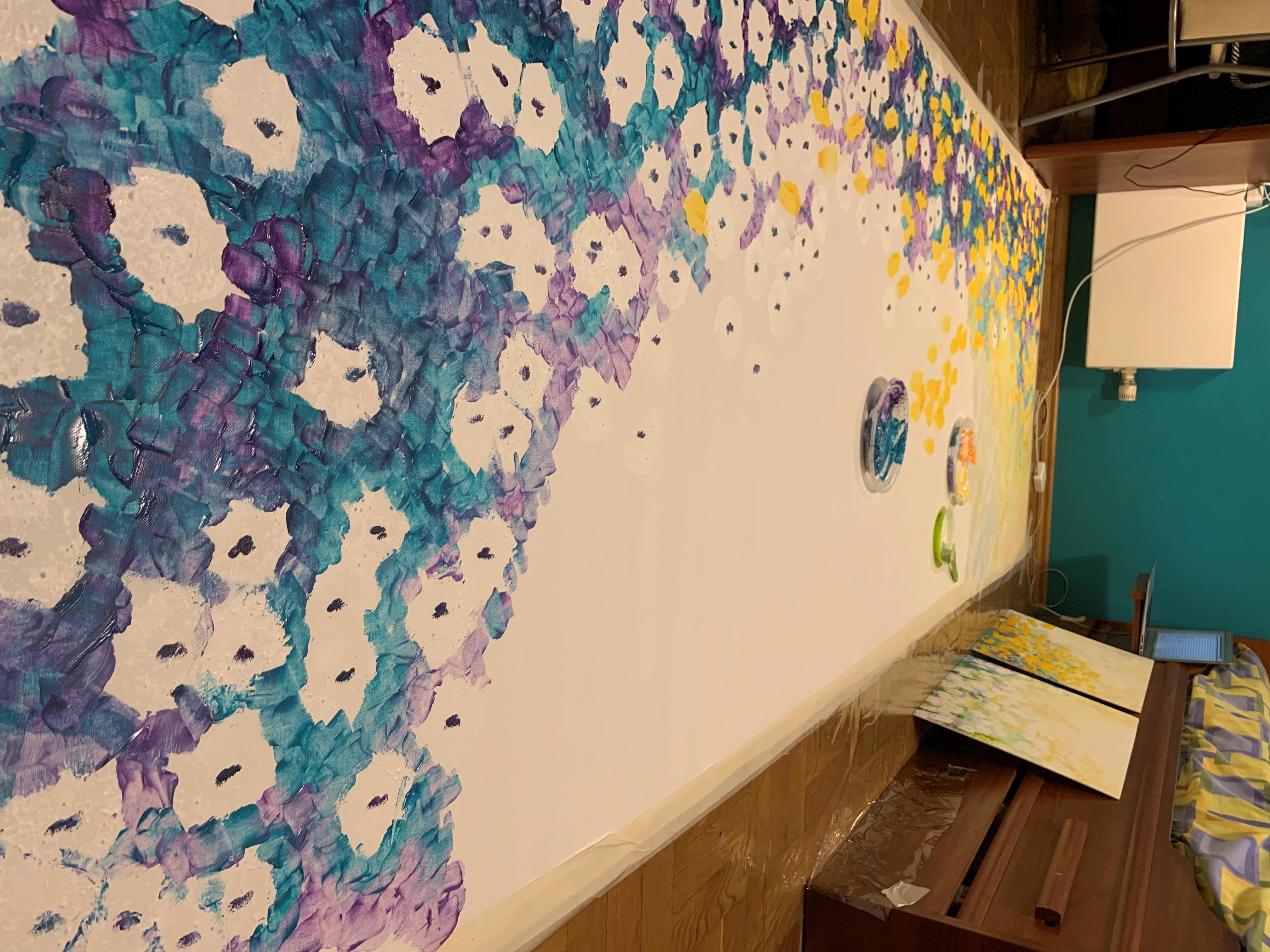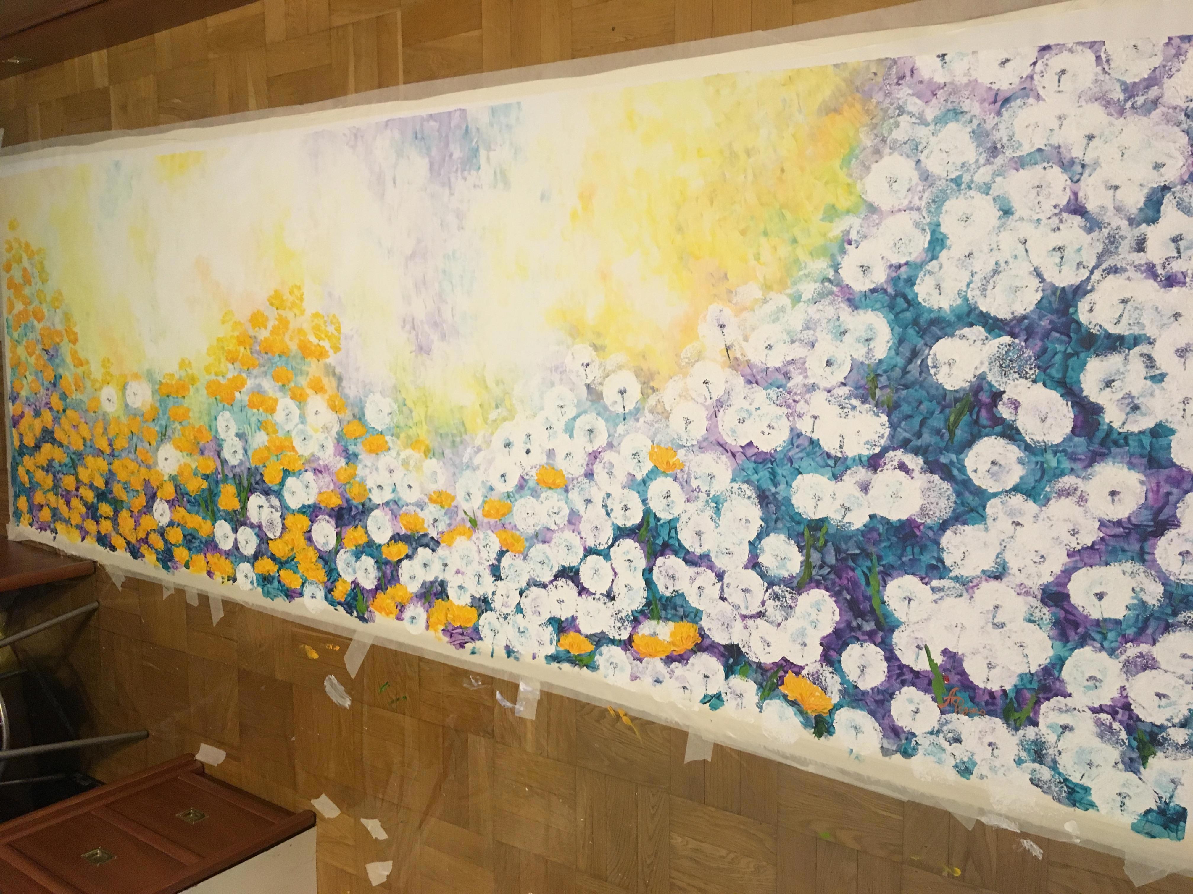 А при том, что это для моего бывшего руководителя, и когда я на него работала, у компании был неофициальный логотип - божья коровка. Покрутив получившийся результат (скорей, походив вокруг него) я поняла, что не могу называть это "Жизнь одуванчиков" или каким-то таким громким пафосным именем. Поэтому на 4-х метрах обосновалась красная счастливая точка, а картина стала называться "Божья коровка". Ну, не люблю я пафос, а просто "Одуванчики" еще хуже )))))