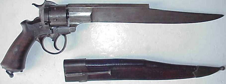 Дальше я постараюсь не говорить про что-то совсем экзотическое и эксклюзивное, сделанное в одном экземпляре. Буду говорить только про те штуки, которые выпускались в достаточных количествах, то есть проверенные временем и людьми. Это – надёжнее. Самое простое, хотя сейчас уже забытое настолько, что даже в кино не встречается – пистолет со штыком. Да, сейчас штык сохранился только на более серьёзных стрелялках типа автомата, но когда-то штыками и пистолеты почти повсеместно снабжали. Причина и появления, и исчезновения пистолетного штыка проста – изменились боеприпасы. То есть, когда пистолеты были ещё кремнёвыми и капсюльными, то на их перезарядку требовалось много времени, а где его взять, если противник быстро бегает? Не будет супостат ждать пока вы свой кольт перезарядите 15-20 минут. Вот и присобачивали сплошь и рядом к высокотехнологичному револьверу архаичный ножик. Таких много было… Вот такие, например: