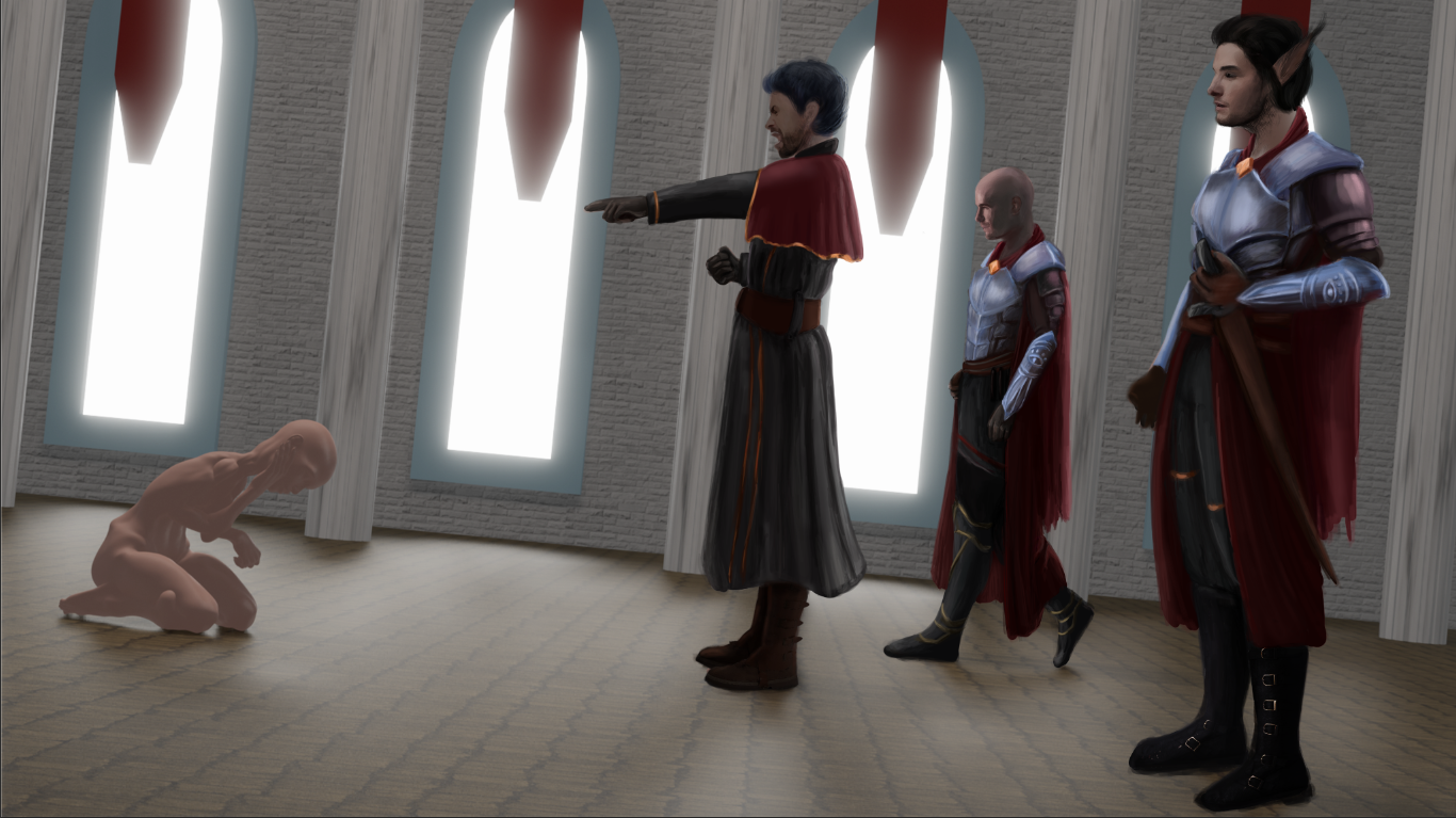 Итак, в первую очередь прорабатываю концепт. Быстрый набросок. Я хочу сделать четырех персонажей в огромном зале с большими окнами.