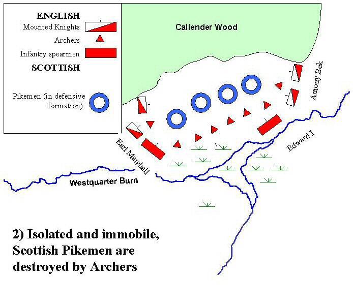 Увидев поражение противника «Стражи Шотландии» во главе с сэром Комином и его кланом контратаковали англичан, не послушав приказа Уоллеса стоять на месте. Оправившаяся после двух поражений, но поддержанная латной пехотой английская конница буквально разметала их. После чего англичане предприняли третью атаку на шилтроны и снова потерпели полное фиаско, а их отступление в этот раз приняло панический характер.