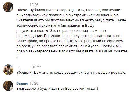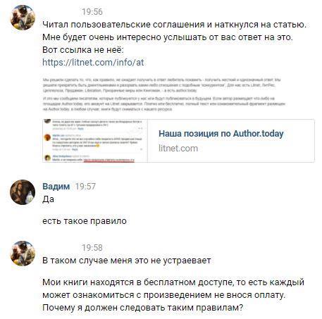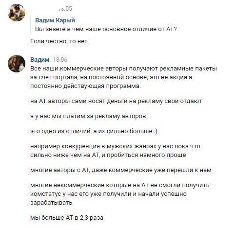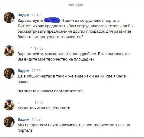 Написали, значит, мне в ЛС для, якобы, обратной связи. Но какого же было моё удивление от последующих "новостей"! Написал мне в соц. сети ВКонтакте некий Вадим Карый (страница явно создана для рекламных записей или сообщений по типу спама) и предложил сотрудничество с ресурсом ЛитНет. Переписка вела характер ознакомления с целью завладения моим интересом, как начинающего автора. Это выглядит не правильно и местами не этично выкладывать личные сообщения на общий доступ, но я считаю - вы должны знать суть происходящего в полной мере.