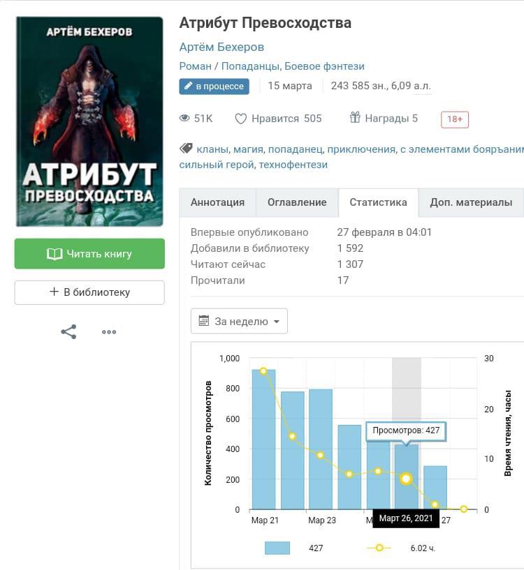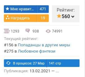 Под конец обучения в Школе стартовал первой книгой новой серии. Книга встала в ГН в первые сутки. Спустя небольшое время заняла в этом виджете позицию топ-1. Сейчас находится на 4 месте виджета.