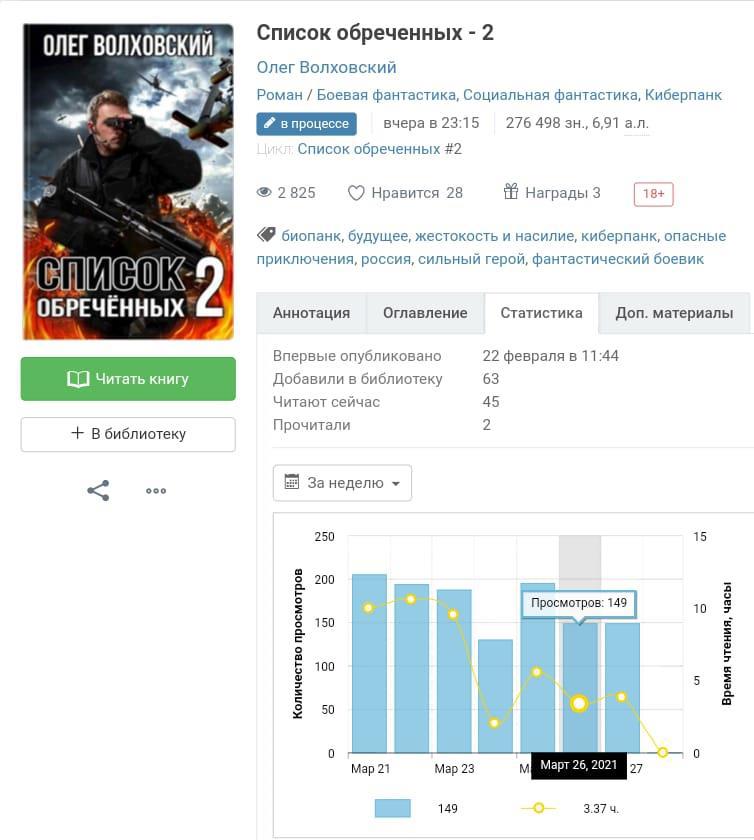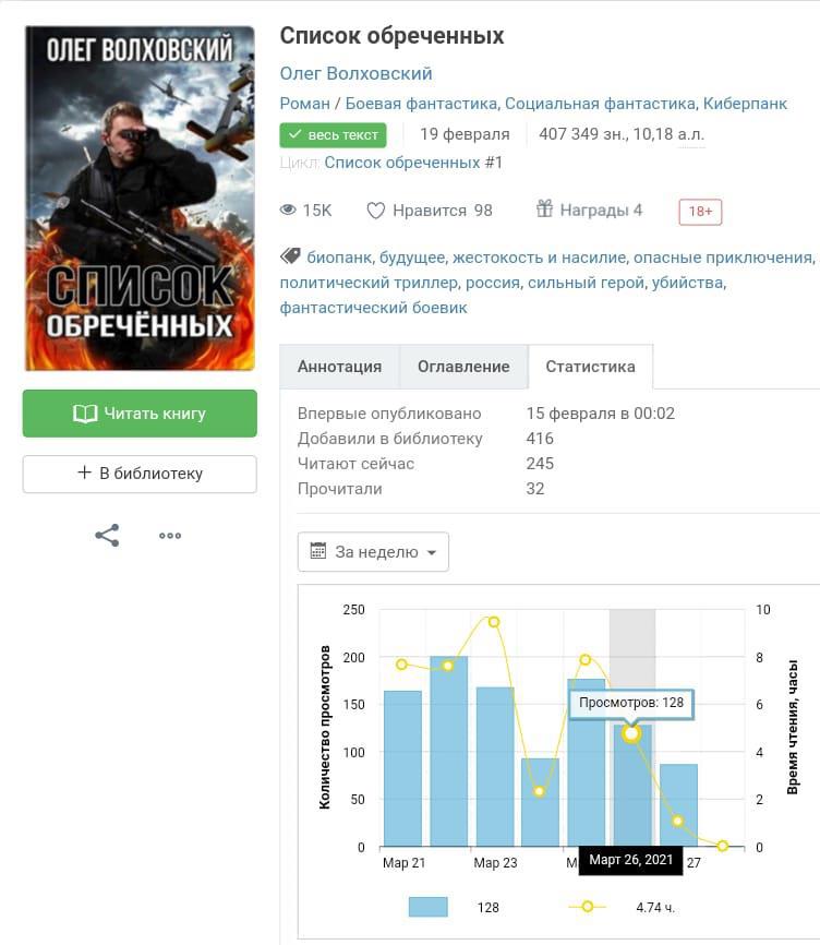 5. Олег Волховский (Наталья Точильникова). Получила КС на базе того, что она публикующийся на бумаге автор. Решила начать заново, на новом аккаунте под привычным уже по бумажным изданиям псевдонимом Олег Волховский. Несмотря на то, что Наталья пишет неформат (жанр книги по сути - политический триллер с элементами остросюжетного фантастического боевика), результатами она осталась довольна и решила продолжить серию.