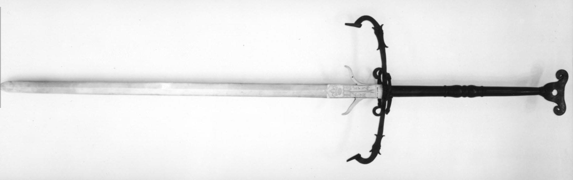 Из-за размера и веса этот меч эсток хочется, как и Норимицу, отнести к показушно-церемониальным предметам, если бы не два «но». Во-первых, о нём и втором, меньшем, эстоке на фото есть запись в инвентарной книге оружейной палаты. Она датируется 1606-м годом и гласит «Два длинных боевых меча с трехгранными длинными клинками, один с прямой, другой с изогнутой крестовинами в черных кожаных ножнах». А во-вторых, присмотритесь к фото крупным планом. Оружие, пережившее последние четыре столетия в «тепличных» музейных условиях покрыто зазубринами и вмятинами. Если бы оно пролежало где-то в земле — не вопрос, там всё обычно в куда худшем состоянии. Но этот эсток то просто висел на стене. Возможно, прежде чем туда попасть, он успел побывать в деле. Хотя может быть это и просто издержки ручной ковки и свидетельства небрежности мастера, кто знает?