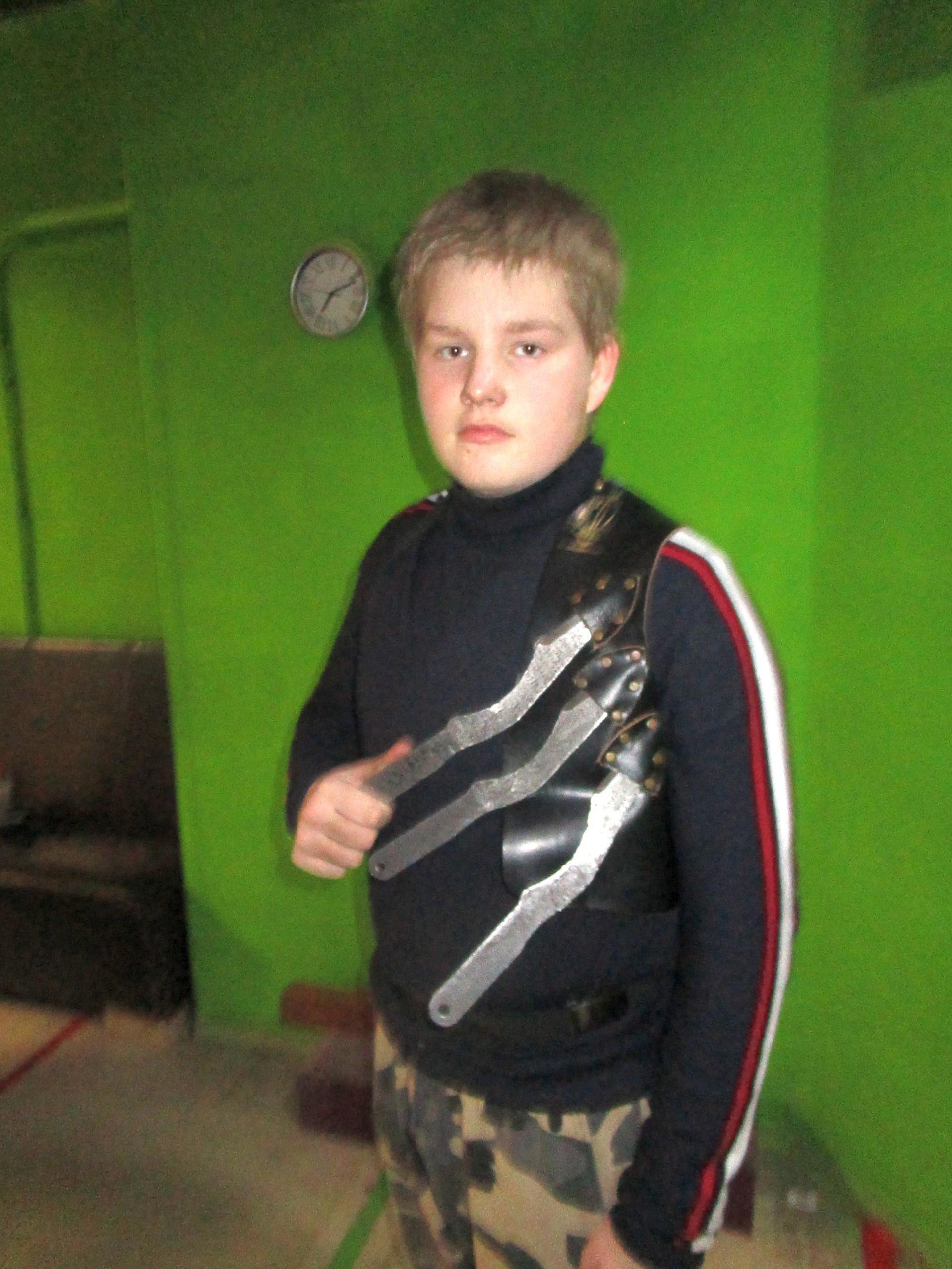 У моего сына ножны на груди, с его любимыми кривыми ножами. Мне удобнее работать с прямыми.
