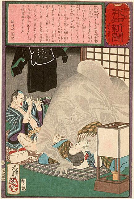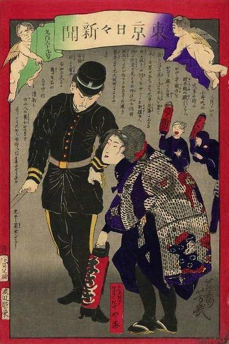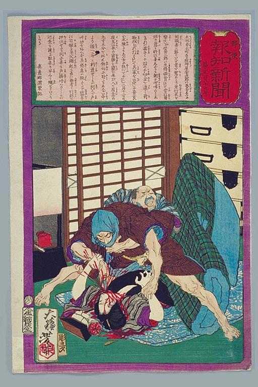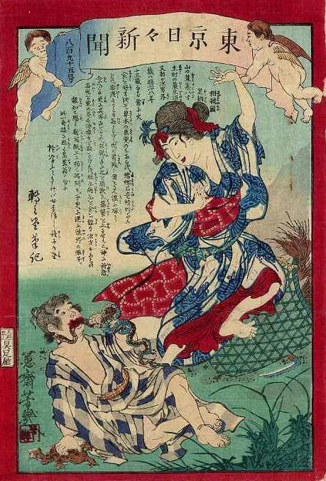 Автор: ОберонЭто статьи из японских газет 1870-х. Точнее, цветных гравюр, которые подписчики получали в качестве приложения к газете. Эти гравюры иллюстрировали самые злободневные новости - убийства, изнаcилования, появления привидений и т.д. Украшены они были изображениями крылатых ангелочков. Так же интересно, что предварительно эти гравюры должны были пройти цензуру и получить официальную печать. Лишь после этого из разрешено было публиковать .