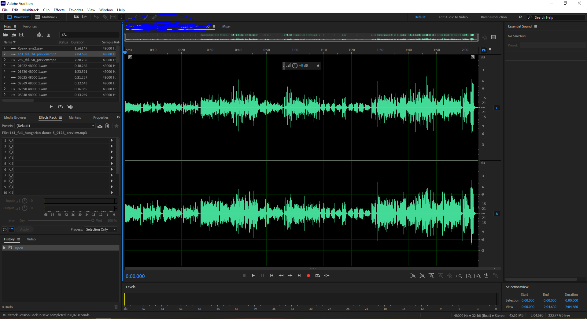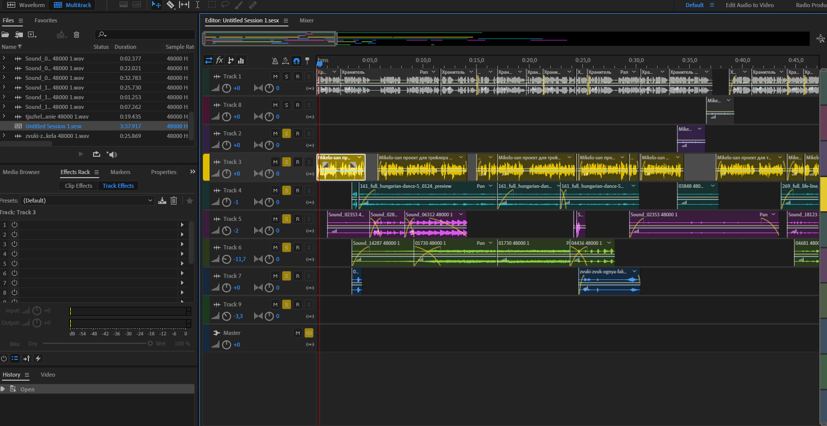 Далее переходим в Мультитрек и начинаем добавлять звуки и музыку. Кстати, в конечной записи вы не услышите оригинальный голос Лыкова. Он прошел значительную обработку. Через тайминг и питч я добавляю ему медлительности и "каменистости".