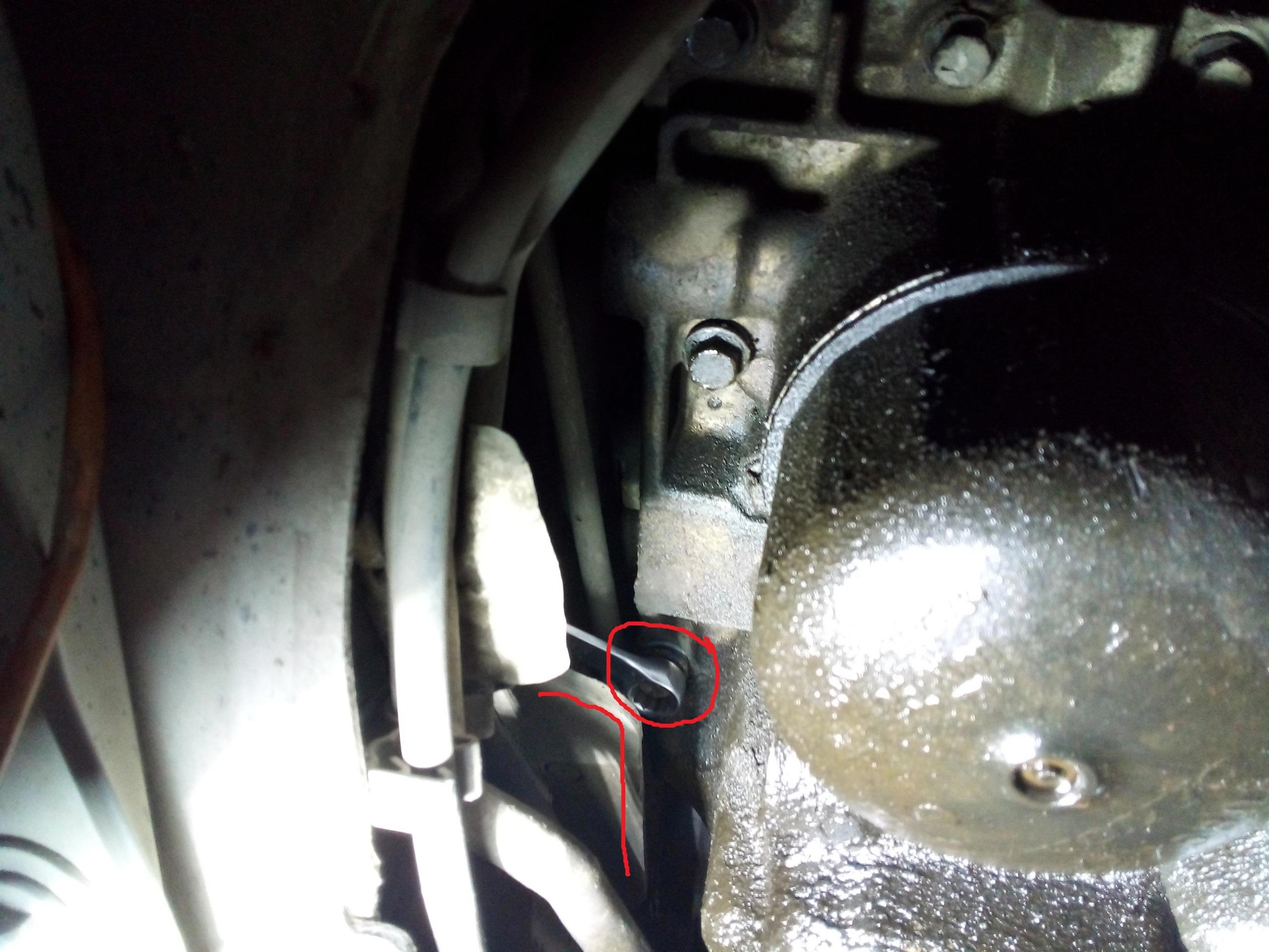 Вольво - это такая машина, у которой в каждом узле есть гадский болт. Вот он есть, и его фиг достанешь! Этот болт прячется за правой опорой двигателя, которая внизу, и выделенным уголком перекрывает к нему удобный доступ головкой. Но я настырный, я открутил! Впрочем, подушку всё равно пришлось снять. Этот гадский уголок не выпускает поддон. Нет, может быть можно было поднажать и всё бы вылетело, но я что-то не рискнул пользоваться такими варварскими методами.
