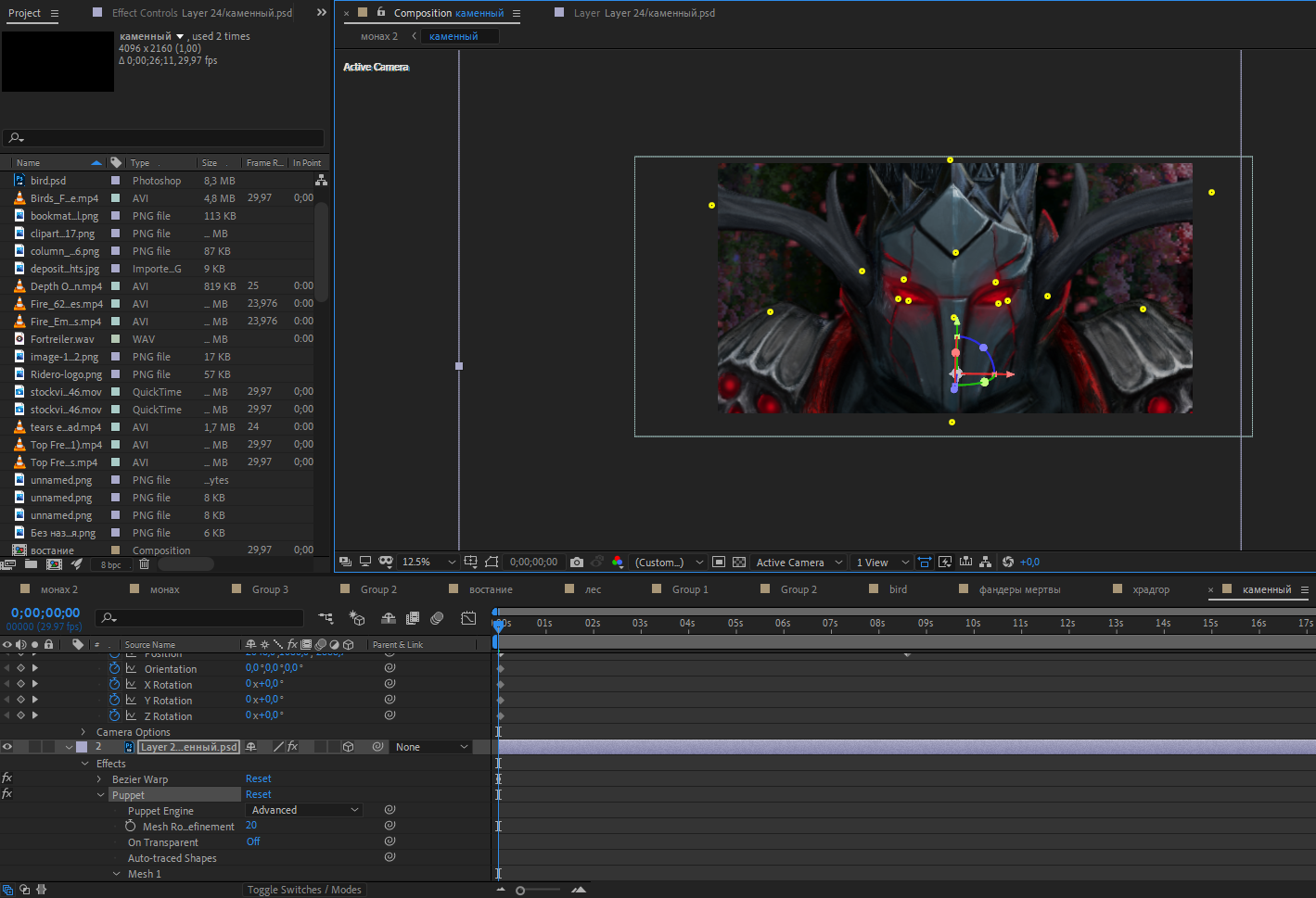Имея под рукой записанную аудиодорожку, легко расставляем нужные сцены и переходим в режим точечной анимации. Здесь я создаю puppets на том объекте, на котором хочу сделать искажения по расстоянию и площади сжатия.
