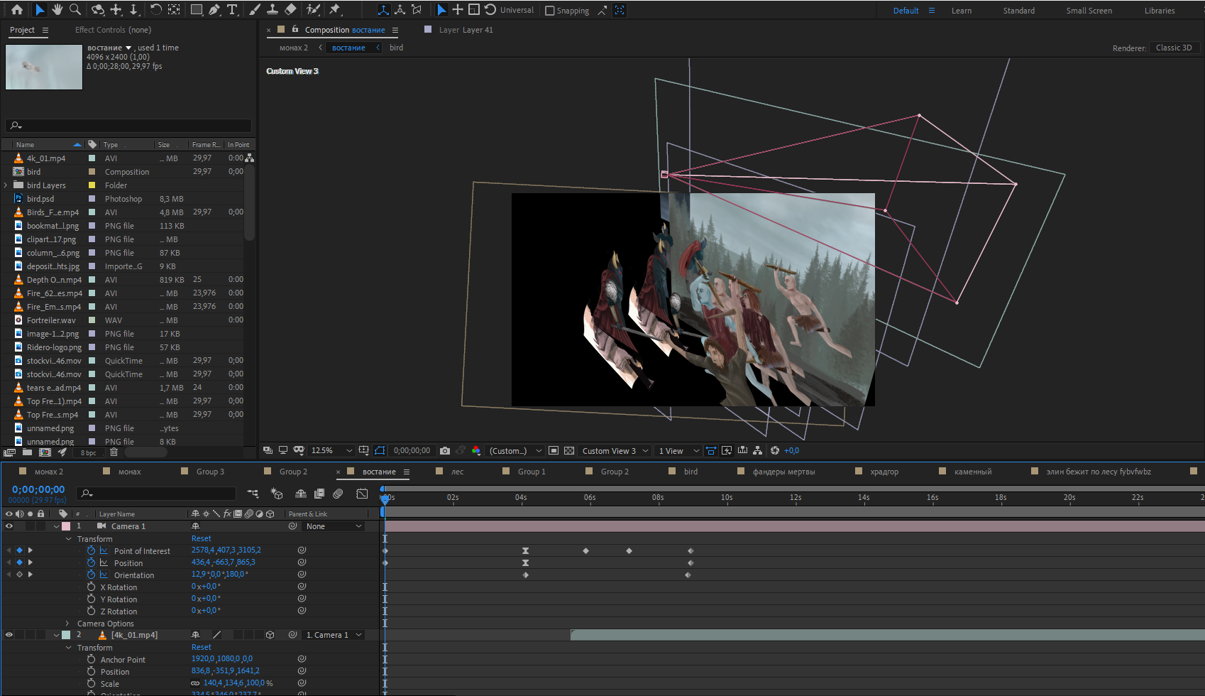 В этом режиме я добавляю камеру и открываю 3D редактирование. Каждый слой рисунка (который готовится заранее) разбиваем по плоскостям. Те объекты, что находятся ближе по перспективе, ставим вперед. Дальние, соответственно, назад. Новые версии Adobe after effects позволяют объединить положение, масштаб и вращение в один простой инструмент, так что проблем с этим не должно возникнуть.