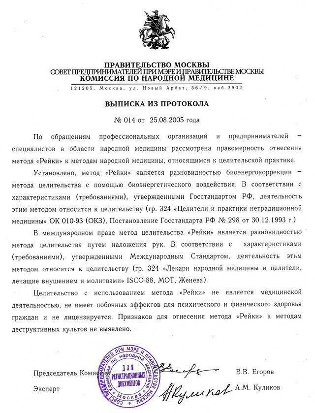 и прикрепляю документ, что Рейки признано официально.