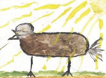 На рисунке изображена жертва генетического эксперимента учёных: птица-колбаса. Чтобы она не укатилась - ей были имплантированы две триноги, стоя на которых она, подвергается жёсткому излучению рентген-лампы, лучи которой пронизывают бедное животное насквозь. Вероятно, по задумке автора, именно это излучение является причиной роста колбасы в неволе. Для удобства птица создана так, что взрослую особь сразу после того, как привезут в магазин, подвешивают за хвост.