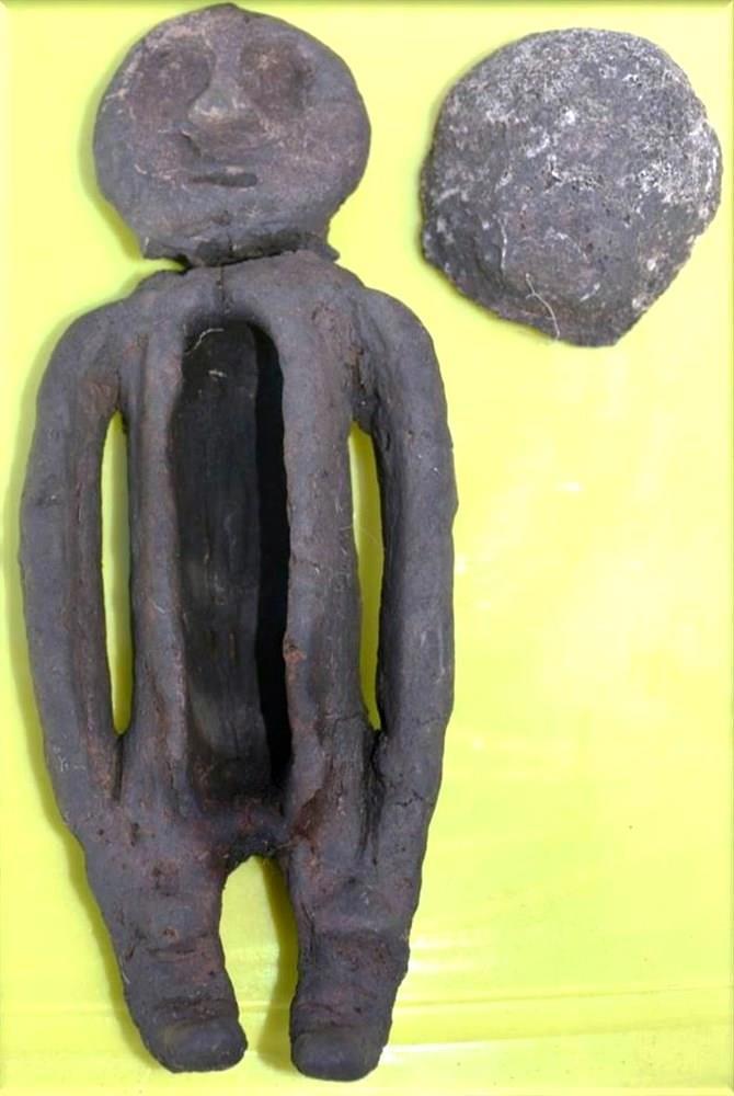 Но и это ещё не всё… «эттолько присказка, ска-а-а-зка впереди» (это из дворовой песенки. Не знаю, кто написал). Так вот… «на плече» у одного из покойных обнаружили странноватую статуэтку из глины. По описанию ноги короткие, руки длинные, голова отломана и повёрнута назад, на лице наколка и маска. Но главное – туловище без талии и половых признаков, которое представляет из себя этакий пенальчик без крышки. Внутри лежала «бронзовая пластина», которую не показали. Вот, посмотрите сами: